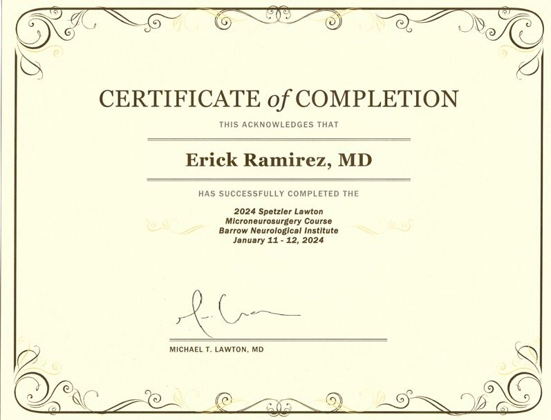 Neurocirujano egresado del Hospital Central Sur de Alta Especialidad, PEMEX, avalado por la Universidad Autónoma de México, en donde recibió Mención Honorífica por su gran dedicación y empeño, como Neurocirujano.