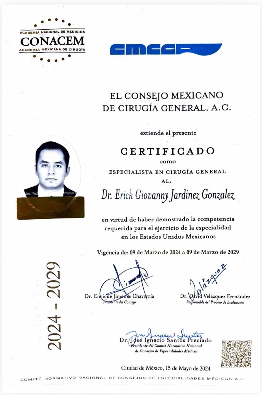 Hola Soy el Dr Erick Giovanny Jardinez González Especialista en Cirugía General. Desde el inicio de mi formación mi objetivo es brindarte una buena atención de eficacia y calidad. Estoy a sus órdenes.