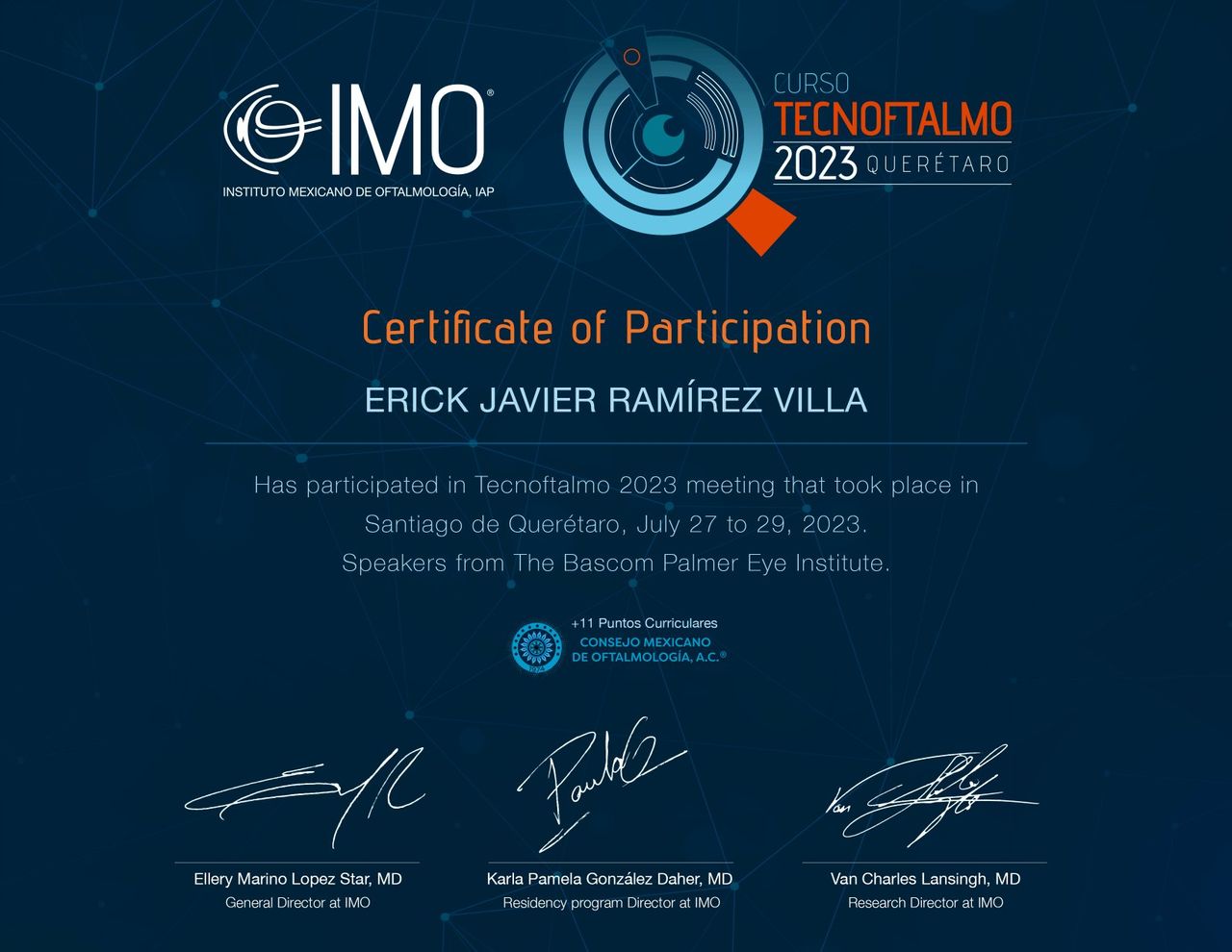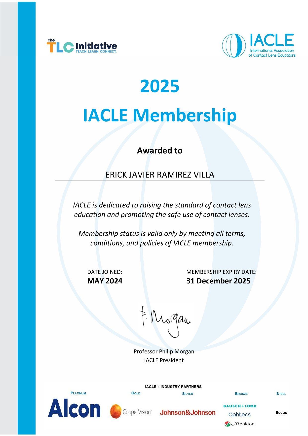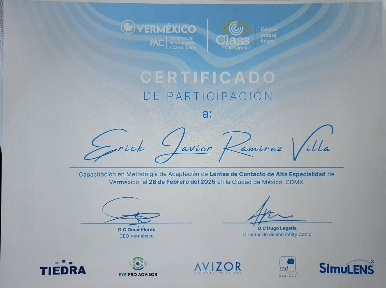 Soy miembro de la Asociación Internacional de Educadores de Lentes de Contacto (IACLE) y cuento con distintos certificados para la adaptación de diferentes tipos de lentes de contacto, otorgados por laboratorios de gran prestigio en México.