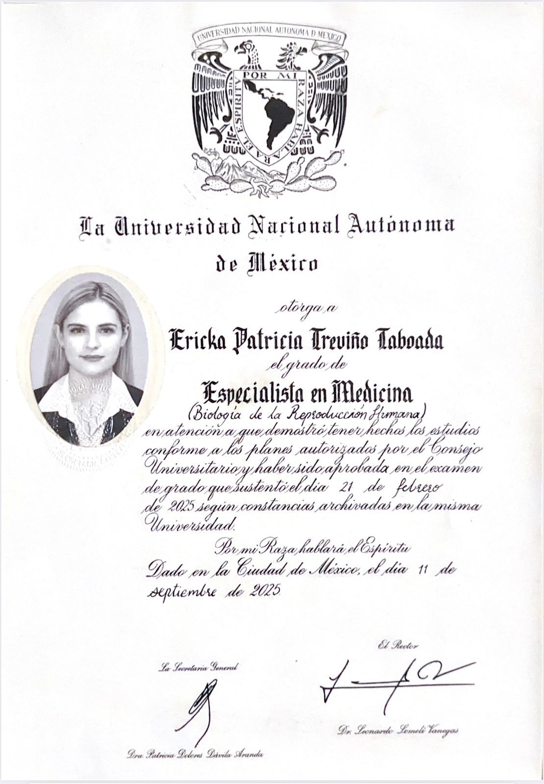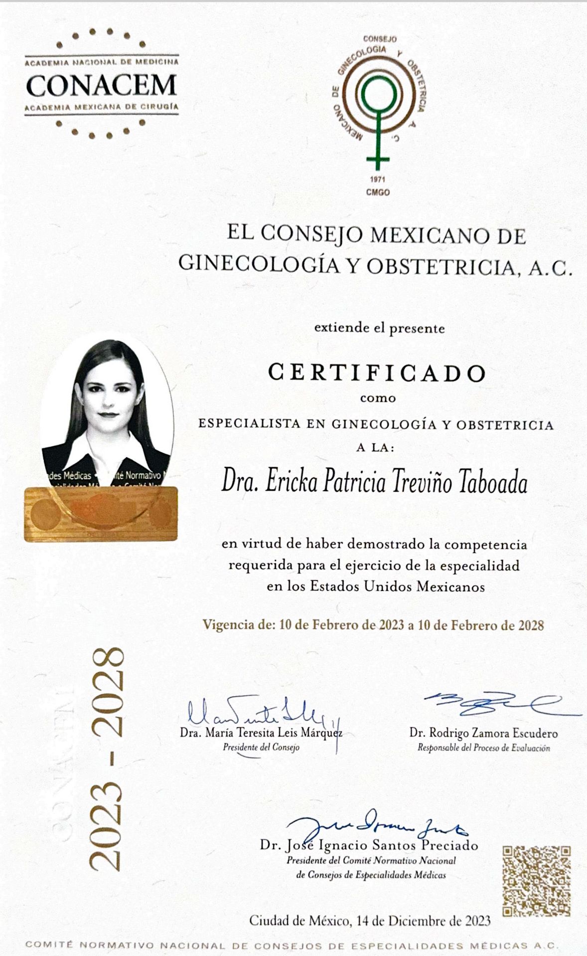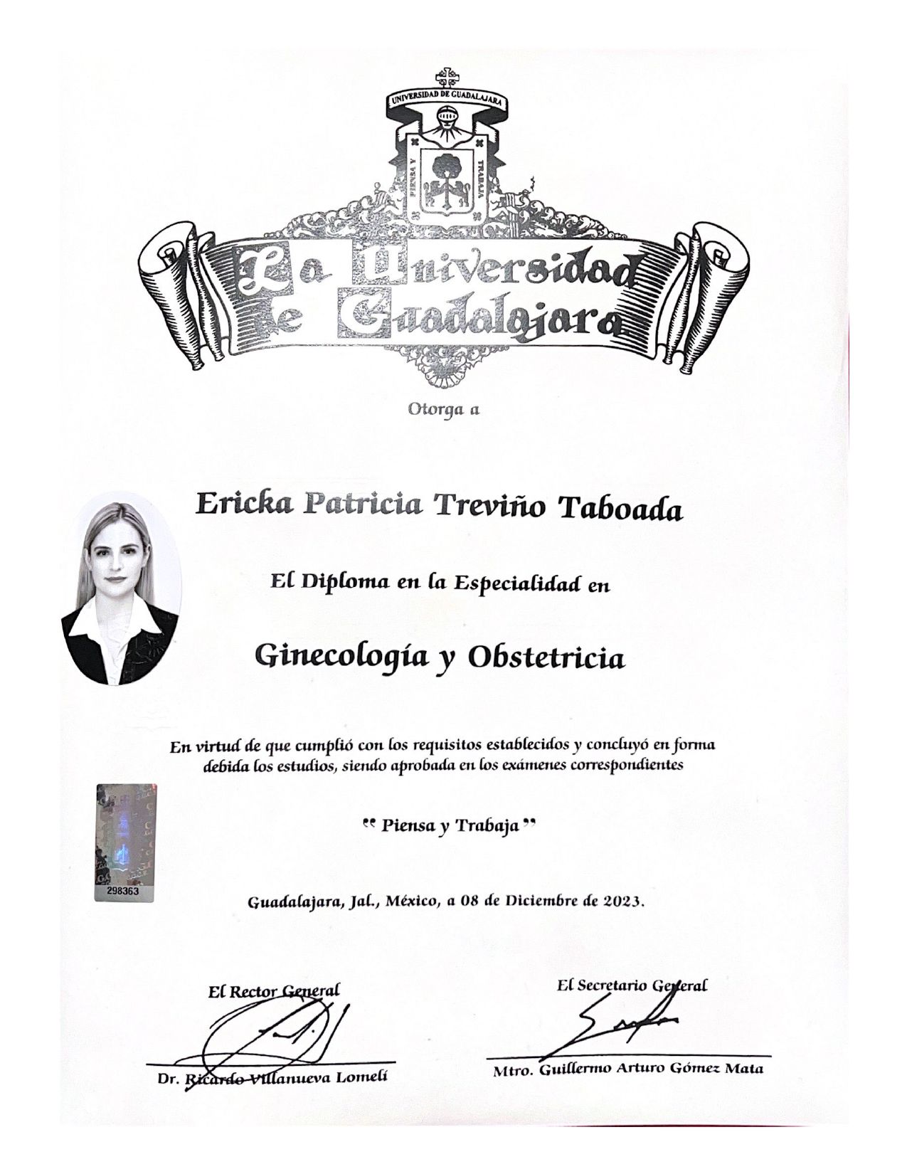 ¡Hola!, Soy la Dra. Ericka Patricia Treviño Taboada, especialista en Ginecología y Obstetricia, certificada por la Universidad de Guadalajara, con subespecialidad en Biología de la Reproducción Humana/ Fertilidad avalada por la UNAM. Alta especialidad en Colposcopía y enfermedades del tracto integral inferior, Láser CO2. Especialista en Cirugía de mínima invasión, Laparoscopía e Histeroscopía. Certificada en Balance Hormonal, Climaterio y Menopausia. Mi vocación siempre ha sido cuidar la salud integral de la mujer, acompañándola en cada etapa de su vida con empatía, respeto y profesionalismo. En mi consulta, busco crear un ambiente de confianza donde puedas sentirte cómoda al expresar tus dudas y necesidades. Brindo atención personalizada en temas de fertilidad, embarazo, anticoncepción y salud reproductiva, con el propósito de ayudarte a tomar decisiones informadas y seguras. Mi objetivo es ofrecerte una atención médica integral que te haga sentir acompañada y en equilibrio con tu bienestar.