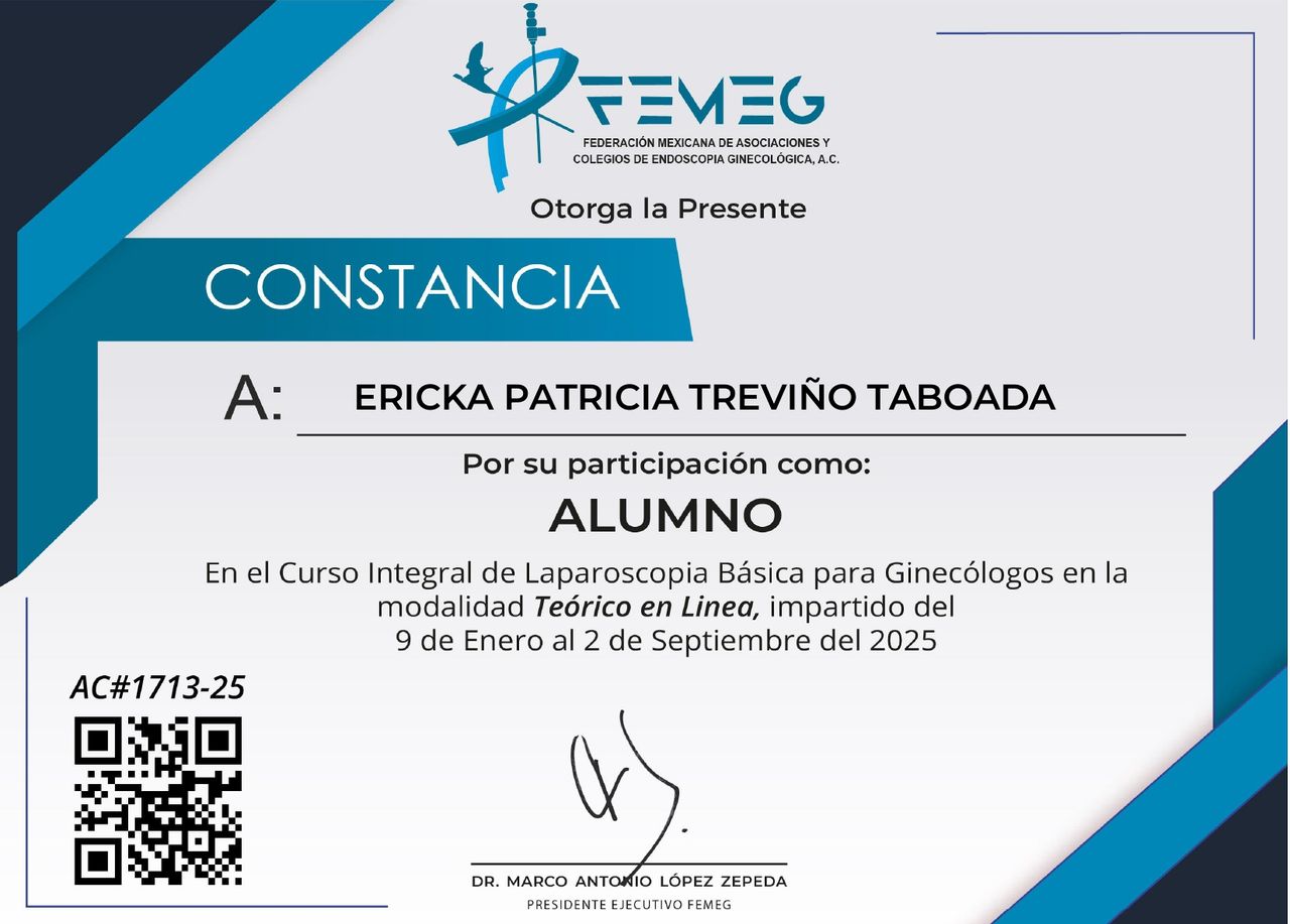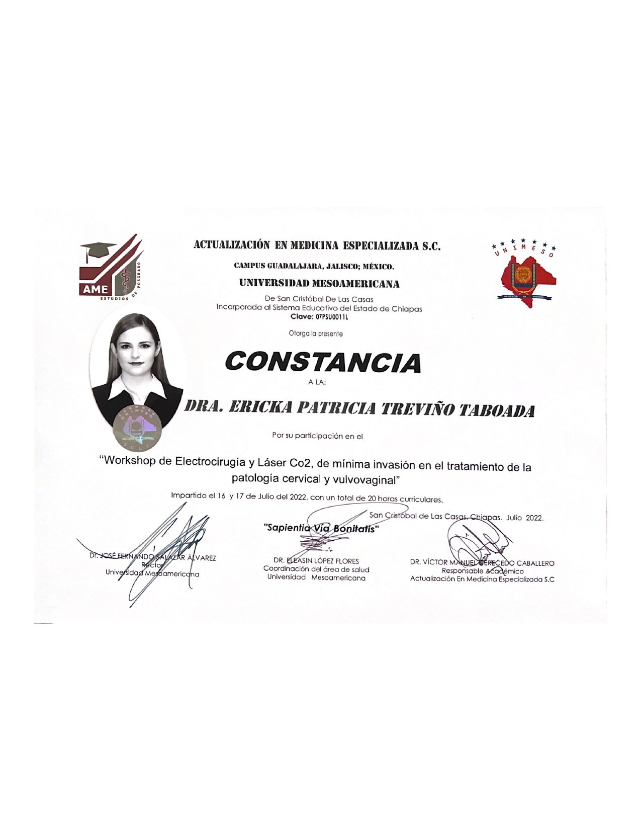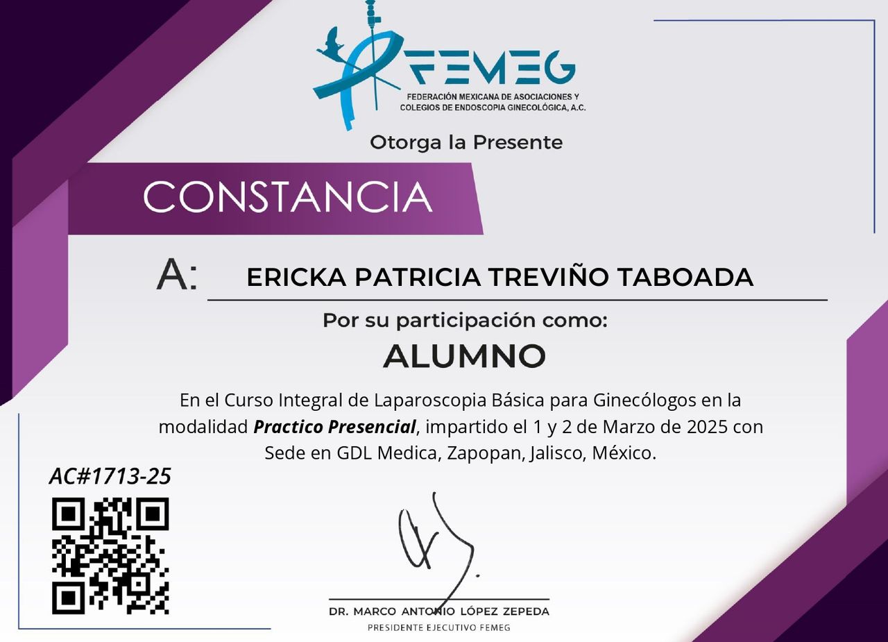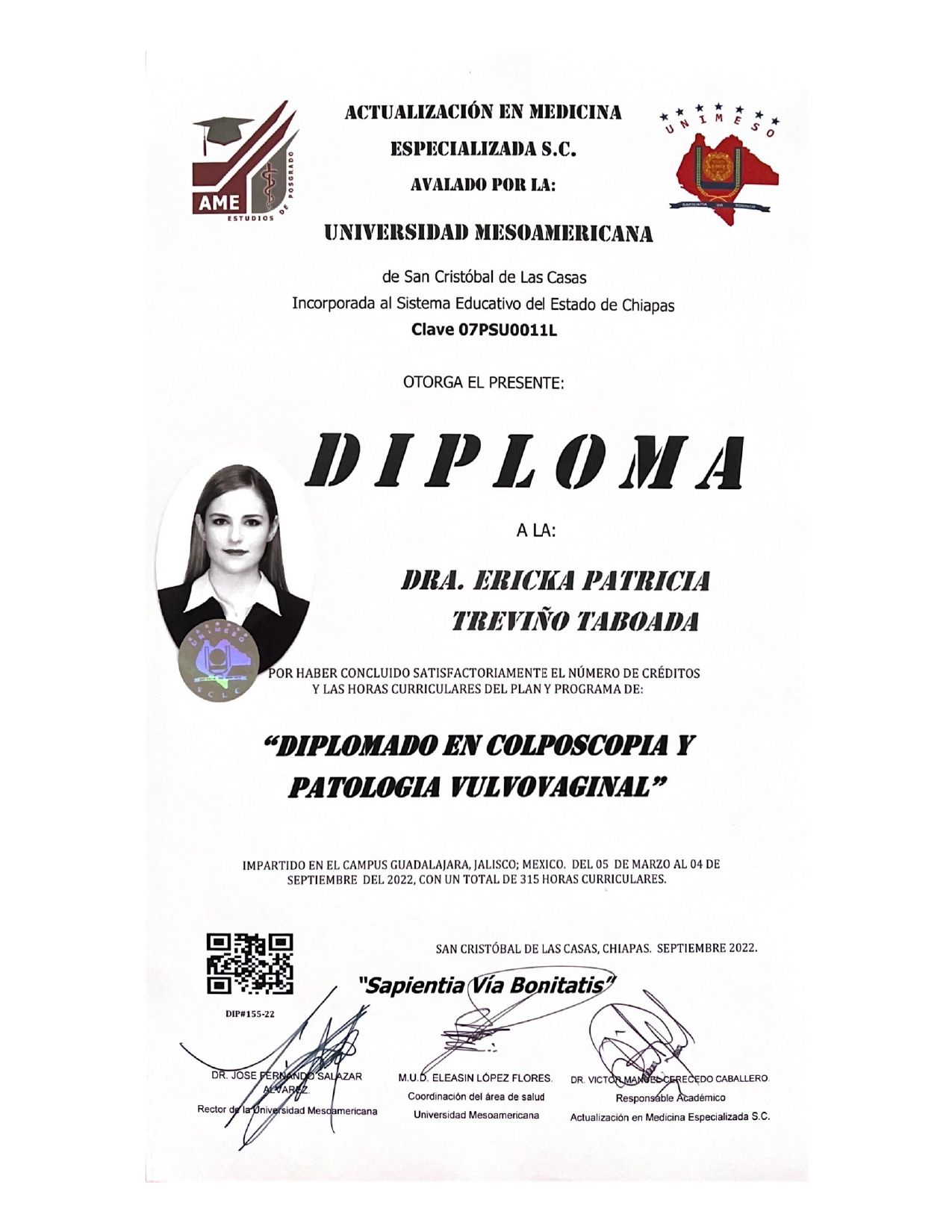 ¡Hola!, Soy la Dra. Ericka Patricia Treviño Taboada, especialista en Ginecología y Obstetricia, certificada por la Universidad de Guadalajara, con subespecialidad en Biología de la Reproducción Humana/ Fertilidad avalada por la UNAM. Alta especialidad en Colposcopía y enfermedades del tracto integral inferior, Láser CO2. Especialista en Cirugía de mínima invasión, Laparoscopía e Histeroscopía. Certificada en Balance Hormonal, Climaterio y Menopausia. Mi vocación siempre ha sido cuidar la salud integral de la mujer, acompañándola en cada etapa de su vida con empatía, respeto y profesionalismo. En mi consulta, busco crear un ambiente de confianza donde puedas sentirte cómoda al expresar tus dudas y necesidades. Brindo atención personalizada en temas de fertilidad, embarazo, anticoncepción y salud reproductiva, con el propósito de ayudarte a tomar decisiones informadas y seguras. Mi objetivo es ofrecerte una atención médica integral que te haga sentir acompañada y en equilibrio con tu bienestar.