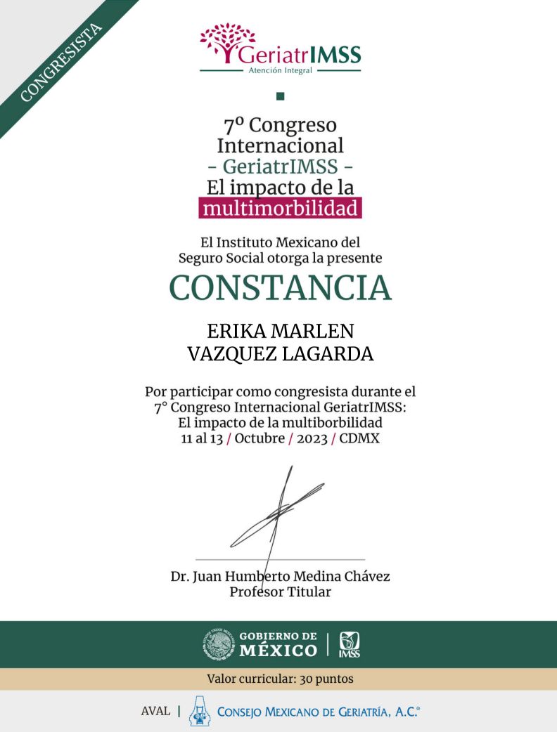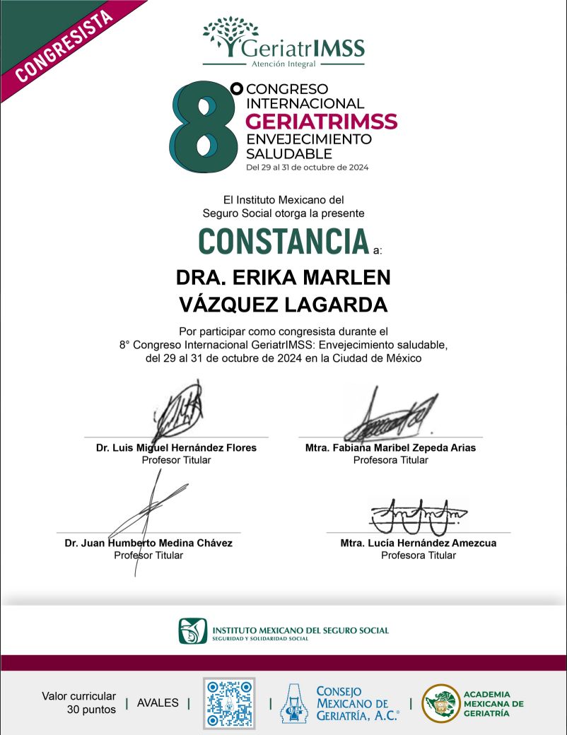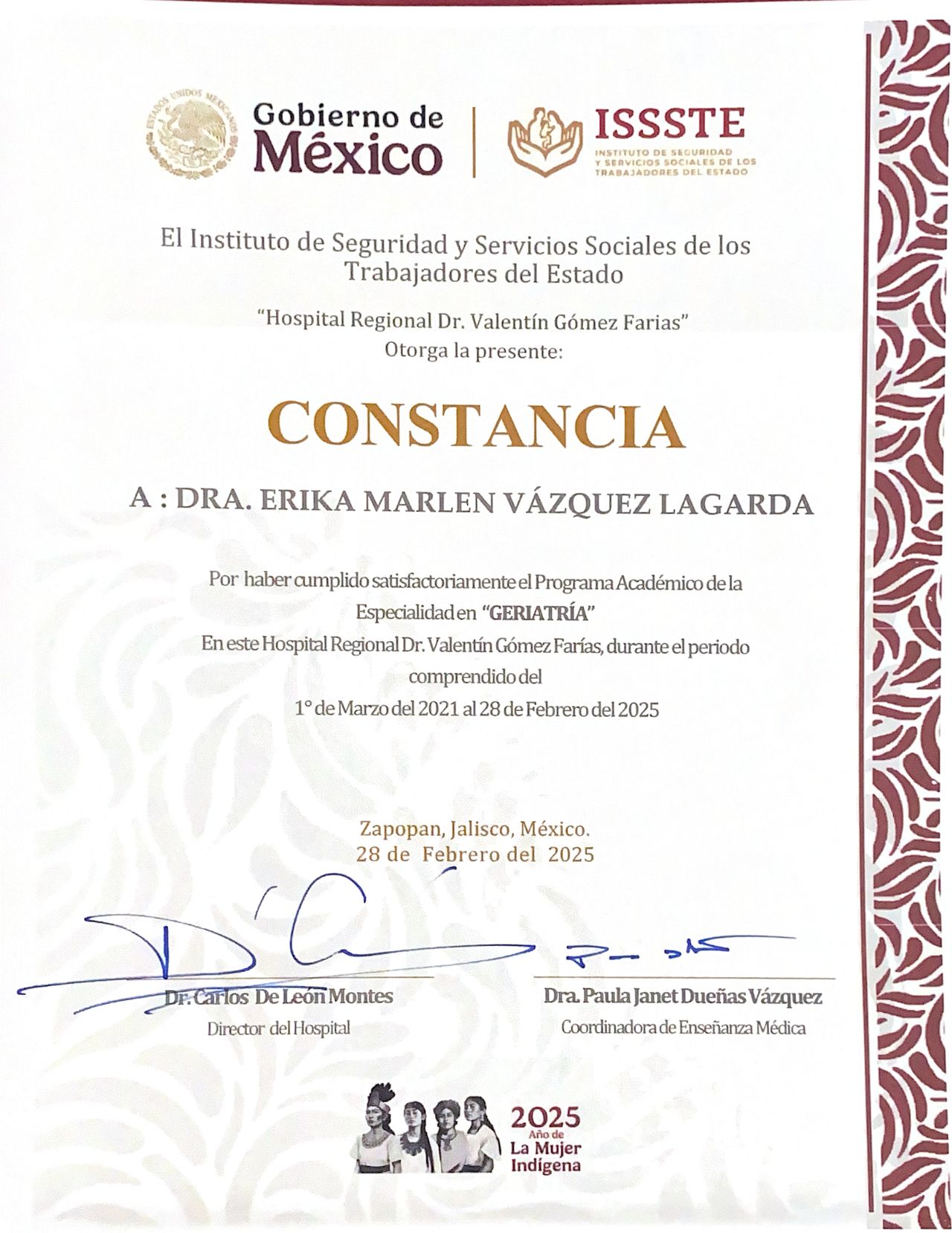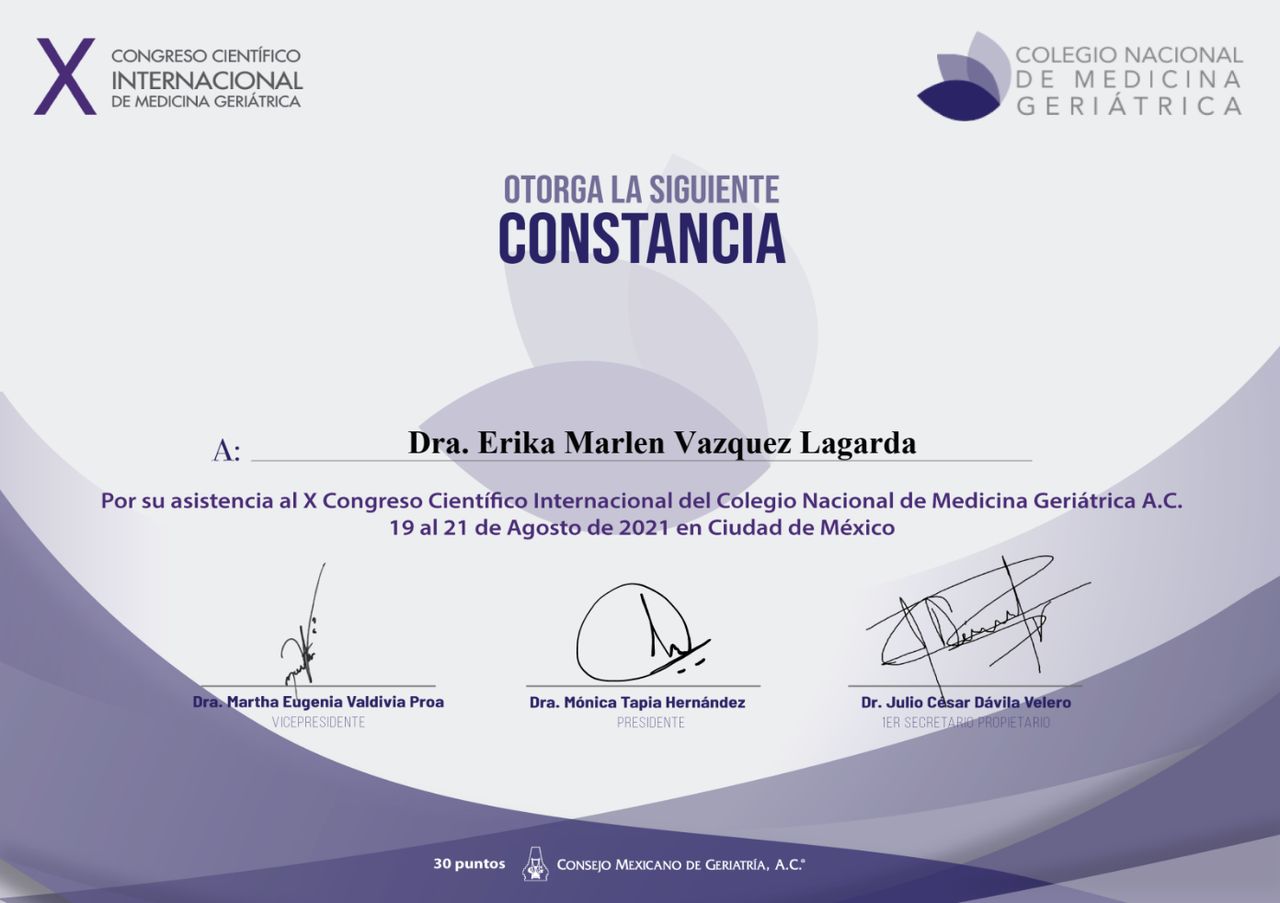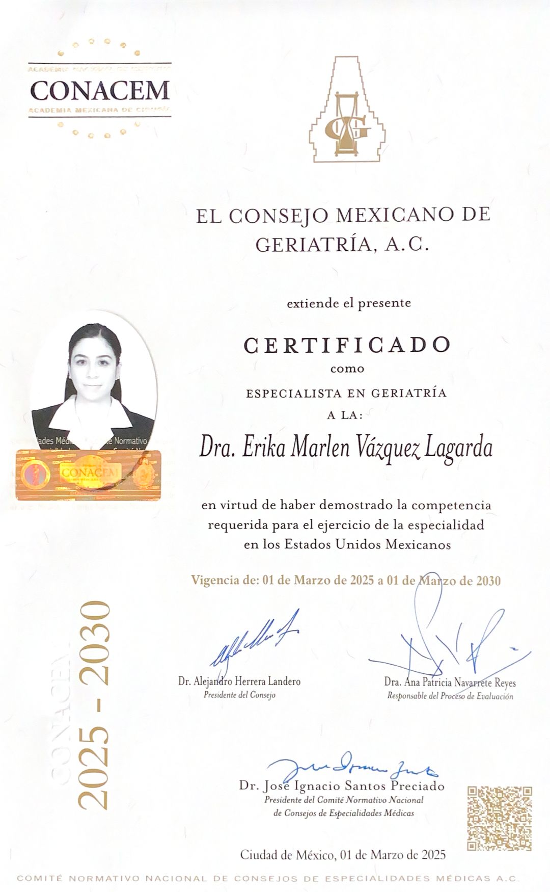 -Actualmente estoy Certificada por el Consejo Mexicano de Geriatría.