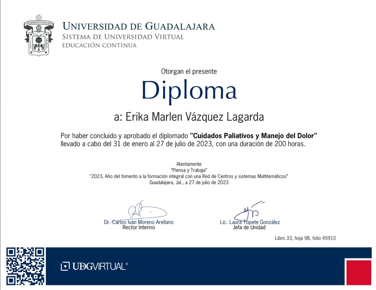 -Cuento con un Diplomado en Cuidados Paliativos y Manejo del Dolor, Avalado por la Universidad de Guadalajara, así como con otros diplomados y cursos, me gusta mucho aprender y enseñar, por lo que siempre busco estar en constante actualización para brindarles un mejor servicio.