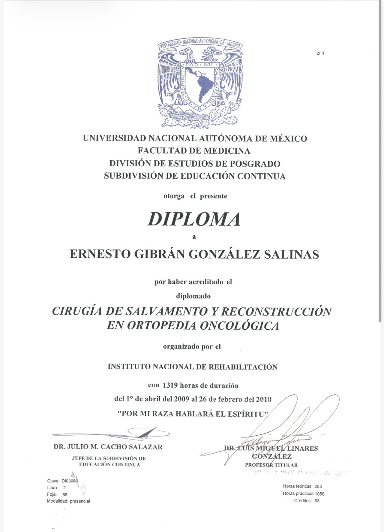Realicé un post grado (sub especialidad) de Alta Especialidad en Tumores Óseos seguido un diplomado para medicos especialistas en Rescate Articular, por un total de dos años. En el Instituto Nacional de Rehabilitación reconocimiento por la UNAM.