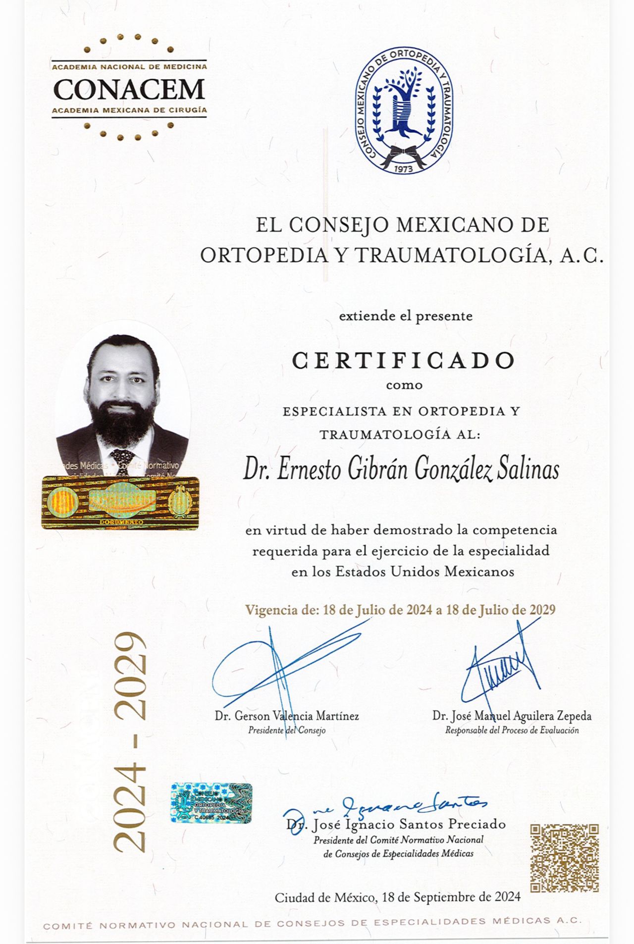 Me encuentro vigente en el Consejo Mexicano de Ortopedia y Traumatología, con certificación vigente hasta el año 2029.