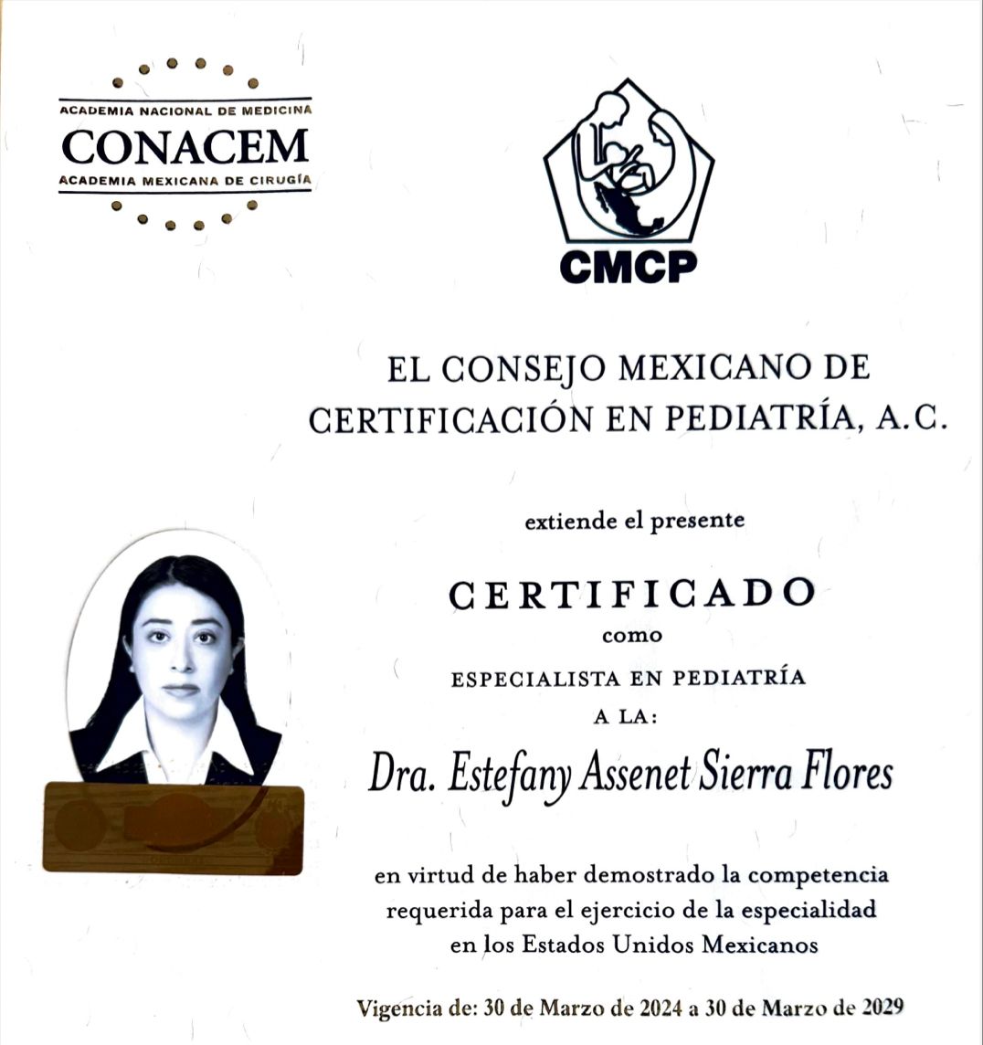 Hola, soy la Dra. Estefany Sierra. Soy egresada de la Universidad Anáhuac como médico cirujano y posterior hice la especialidad en Pediatría durante tres años en el Instituto Nacional de Pediatría en CDMX avalado por la UNAM. Actualmente doy consulta privada en Metepec, Estado de México. Estoy certificada por el Consejo Mexicano de Pediatría y mi objetivo es cuidar la salud de los más pequeños, ayudando a construir un futuro más sano para ellos. Agenda tu cita.