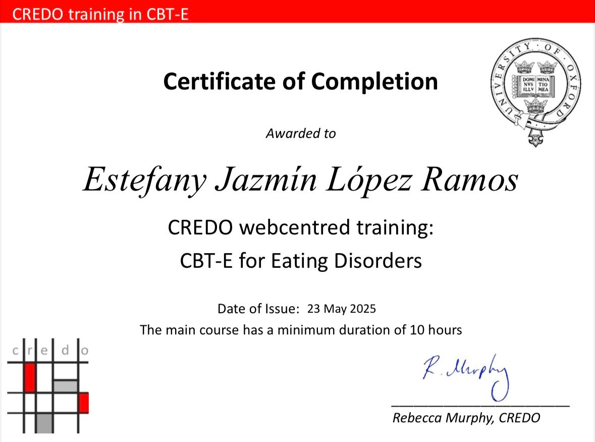 • Maestrante Terapia Cognitivo Conductual por el Centro de Psicoterapia Cognitiva