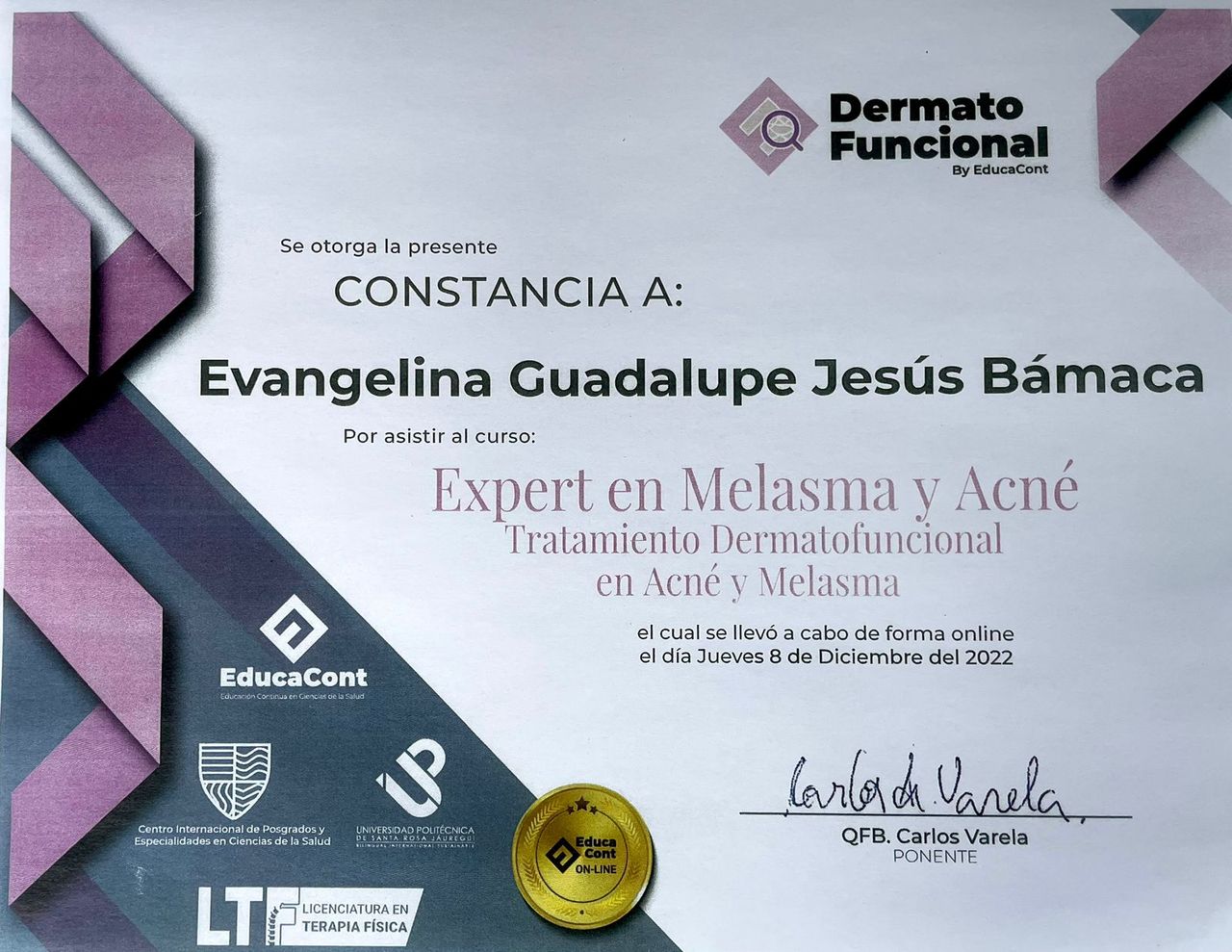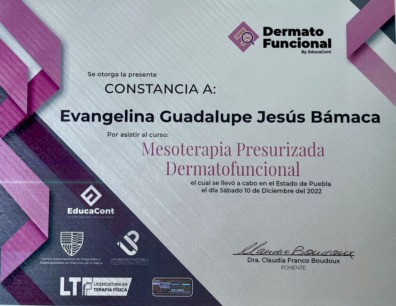 Evangelina tiene un amplio conocimiento que hace que te explique detalladamente cómo va a ser la terapia y que se espera del tratamiento y cuál es el motivo del uso de los equipos que tiene, a demás de estar siempre atenta tus necesidades y a tu comodidad con el tratamiento. Con una actitud súper positiva y muy profesional. Estoy super contenta con el resultado de mis terapias. Recomendable al 100%