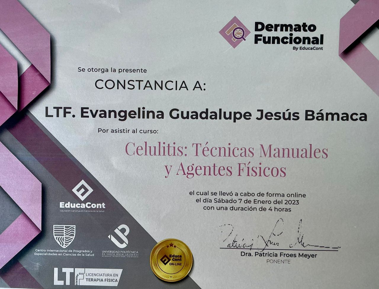 ¡Hola! Soy Evangelina Jesús, soy fisioterapeuta especializada, apasionada por el bienestar integral, ayudo a mis pacientes a recuperar funcionalidad, confianza y calidad de vida a través de terapias personalizadas, tecnología avanzada y un enfoque humano.
