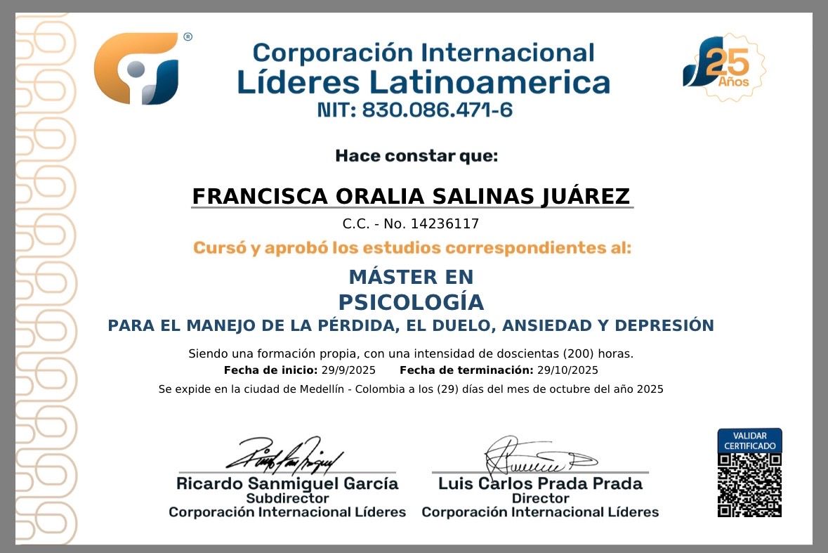 Especialista en Ansiedad, Estrés y Salud IntegralCORPORACIÓN INTERNACIONAL LÍDERES LATINOAMERICAEscucha profesional en un espacio sin juicios.
