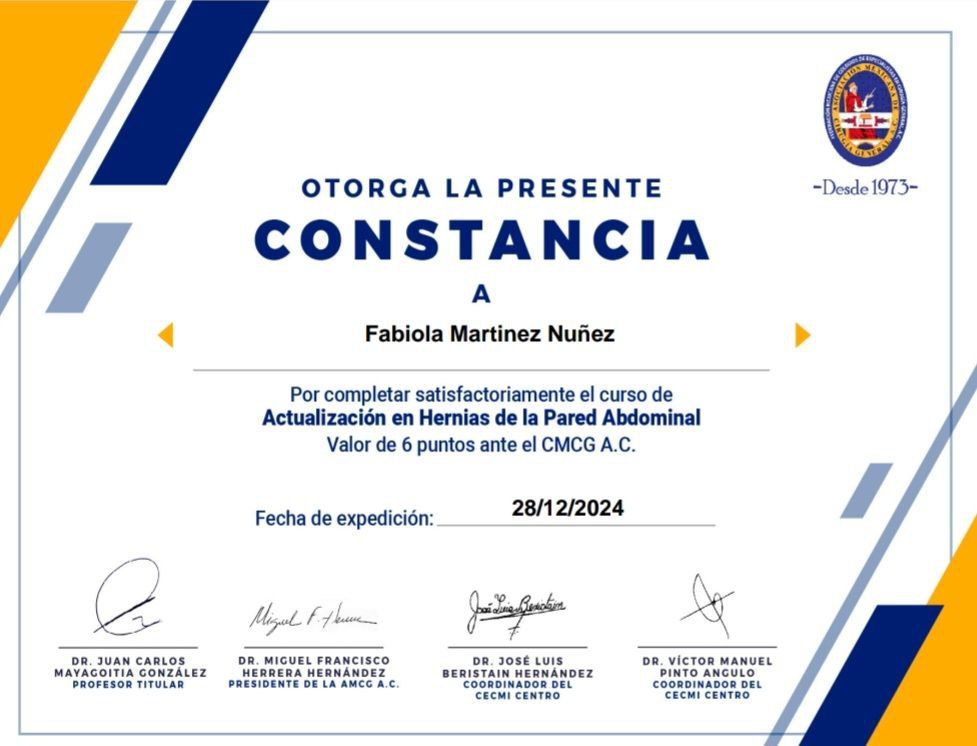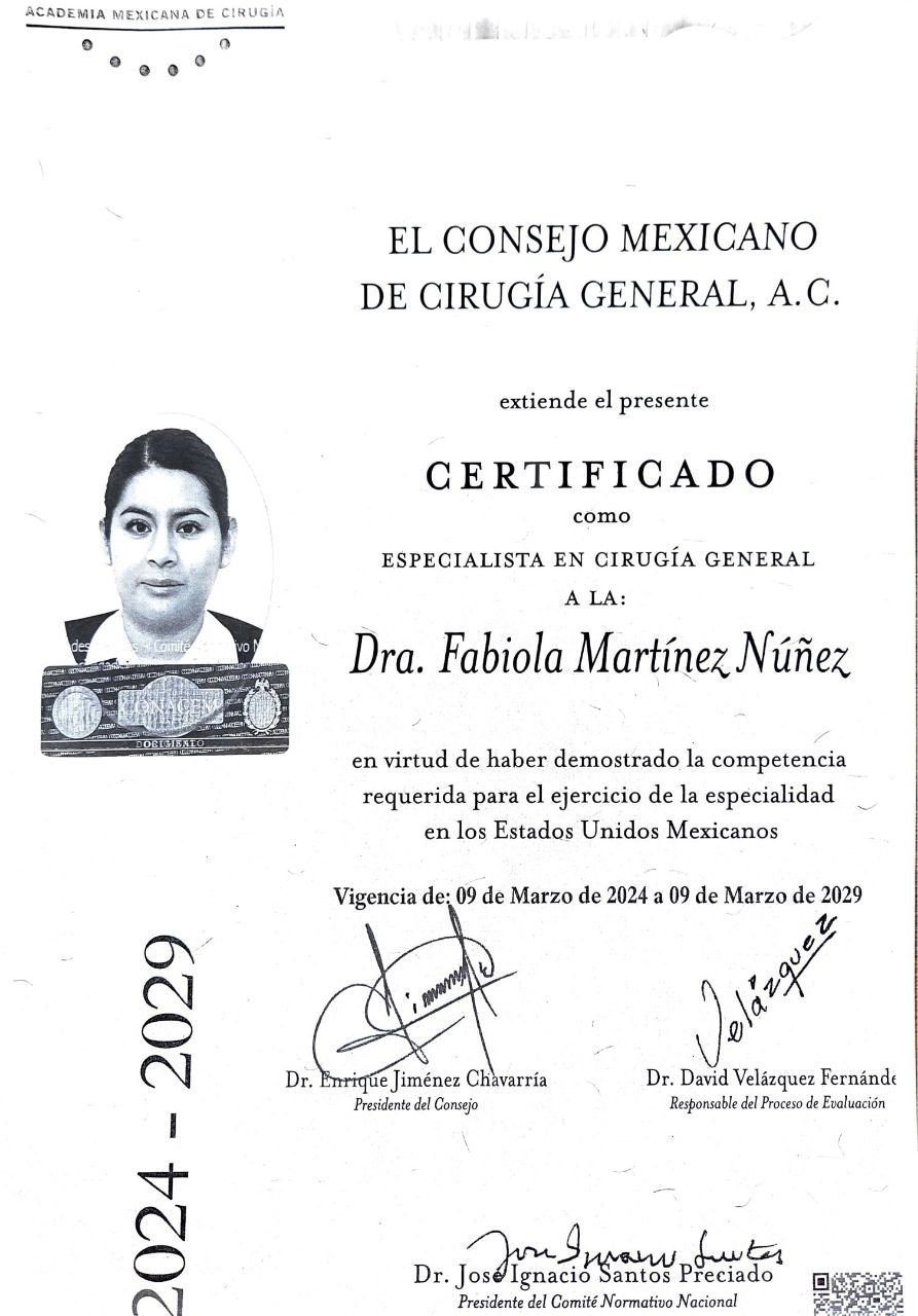 Soy la Dra. Fabiola Martínez Núñez, especialista en Cirugía General y Laparoscópica, me encuentro avalada por el Consejo Mexicano de Cirugía General; trato múltiples padecimientos quirúrgicos del tracto digestivo como vesícula, apéndice, hernia umbilical, inguinal o ventral, colon y recto; cirugía de cabeza, cuello y tórax, así como el manejo de pie diabético. Mi intención es brindarte un servicio con los mas altos estándares de calidad médica y humana, siempre buscando el bienestar del paciente. Tu salud es mi prioridad.