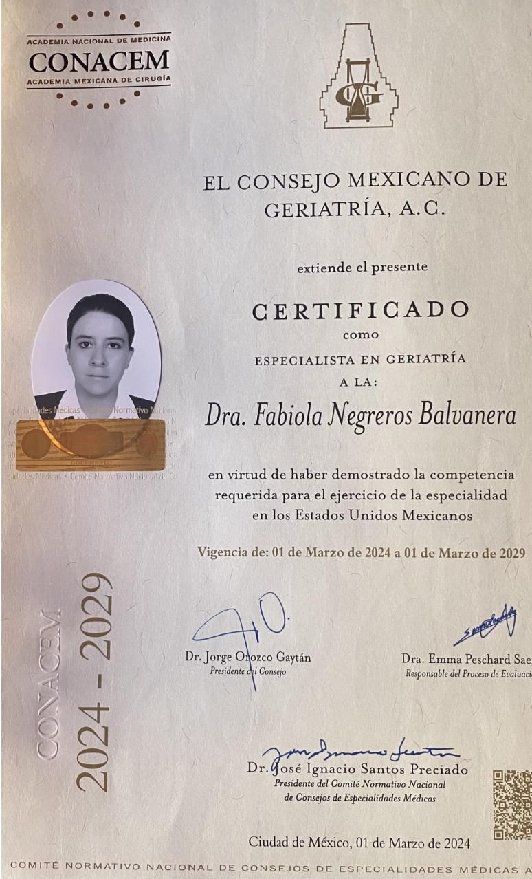 Soy la Dra. Fabiola Negreros Balvanera, especialista en Geriatría.