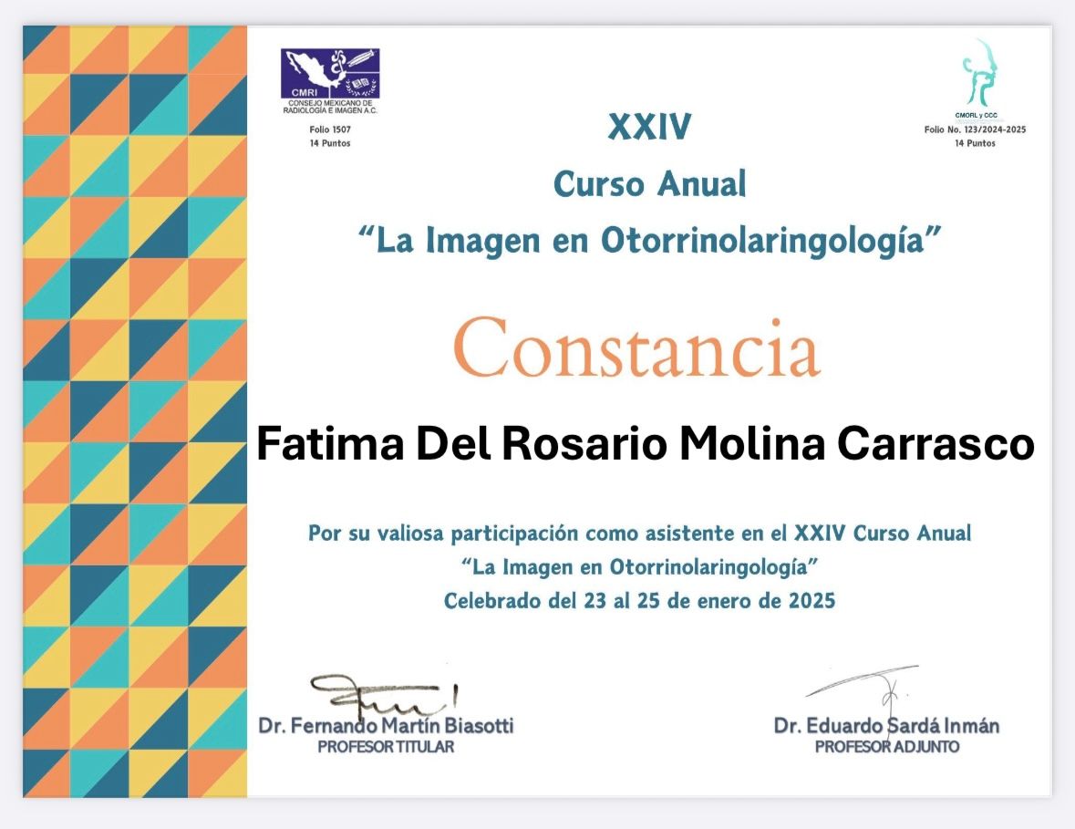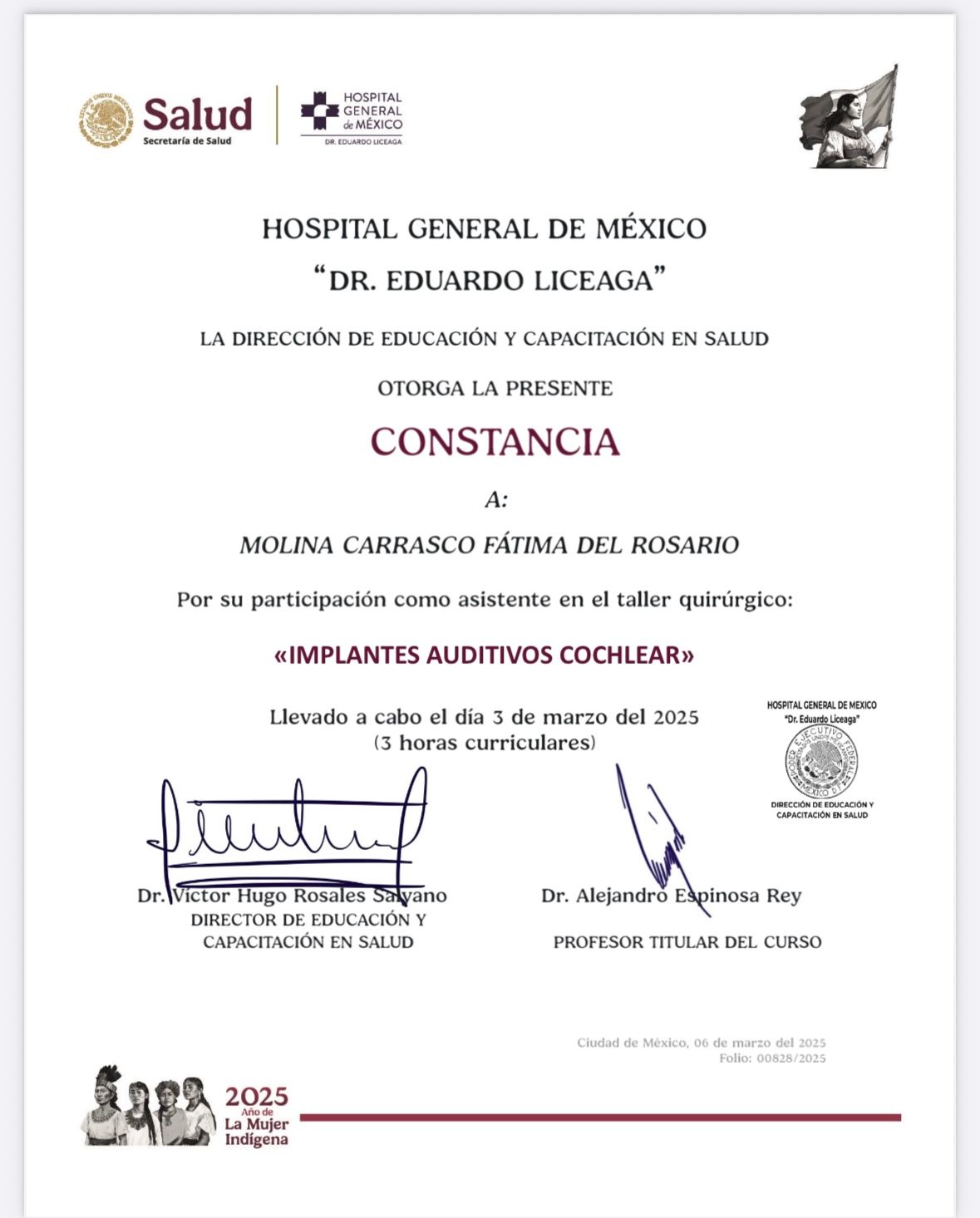 Hola Soy la Dra. Fátima Molina especialista en otorrinolaringología. Me dedico a escuchar tus síntomas, explicarte con claridad y acompañarte en cada etapa de tu diagnóstico y tratamiento.