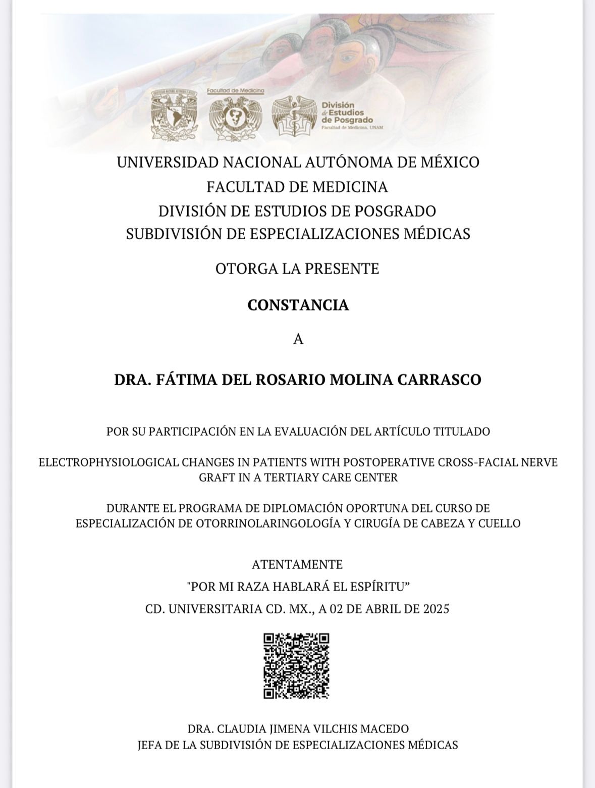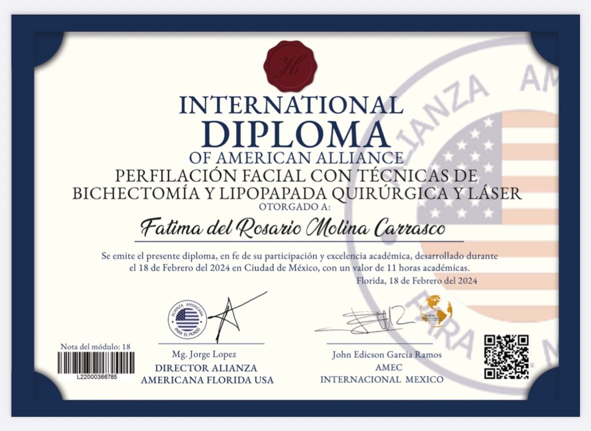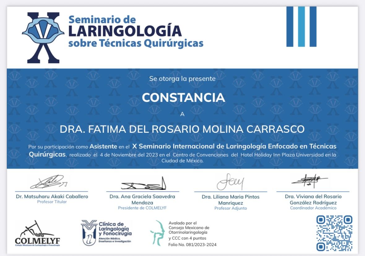 Cuento con diplomados en rinología, cirugía facial, laringología y reconstrucción de la vía aérea, así como en cirugía mínimamente invasiva de nariz y senos paranasales. Estoy certificada por el Consejo Mexicano y soy miembro activo de la Sociedad Mexicana y Española de Otorrinolaringología.