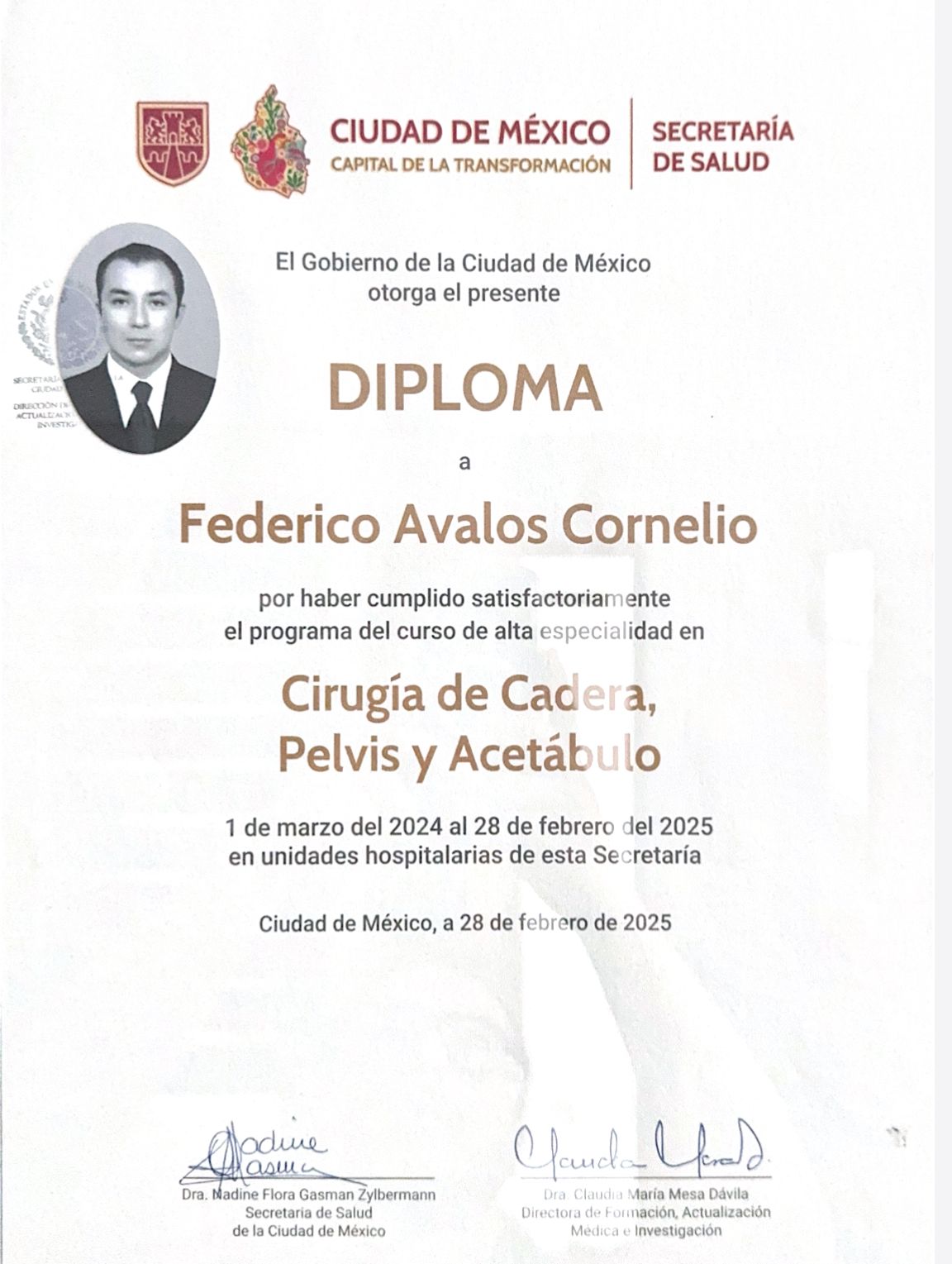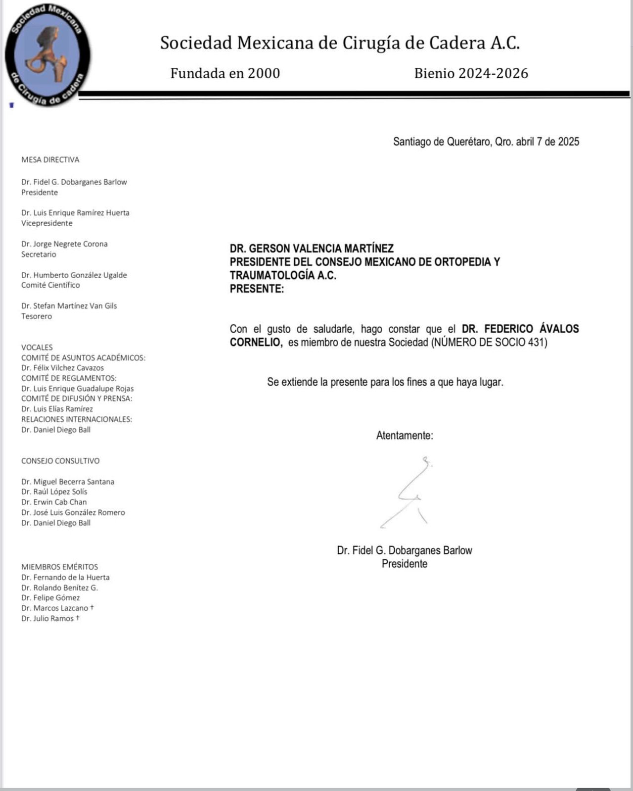 Miembro activo de la Sociedad Mexicana de Cirugía de Cadera (No. 431)