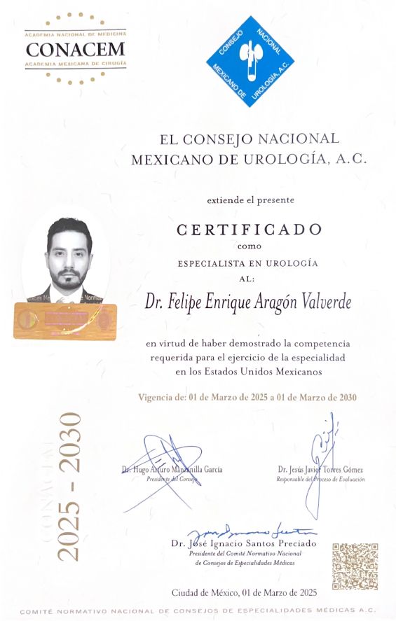 Hola, soy el Dr Felipe Aragón, médico especialista en Urología con Alta Especialidad en Cirugía Robótica y de Mínima Invasión, certificado por el Consejo Nacional Mexicano de Urología.