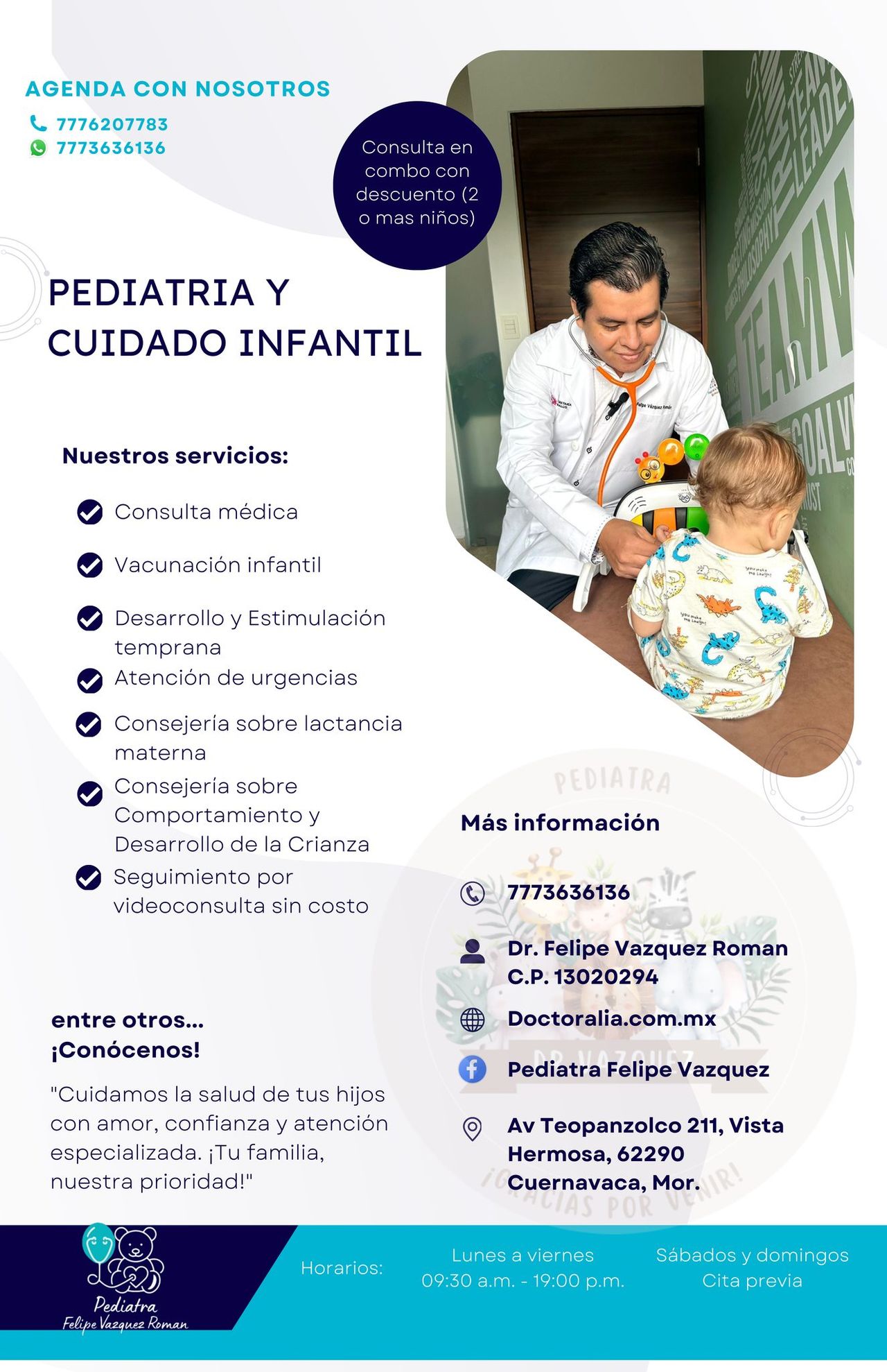 ¡Hola! Soy el Dr. Felipe Vázquez, pediatra con gran vocación por el cuidado de la salud infantil. Mi mayor objetivo es que cada niño reciba una atención médica de calidad y que sus padres se sientan acompañados, tranquilos y con toda la información que necesitan.