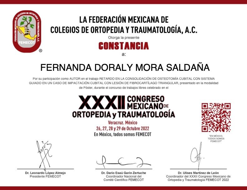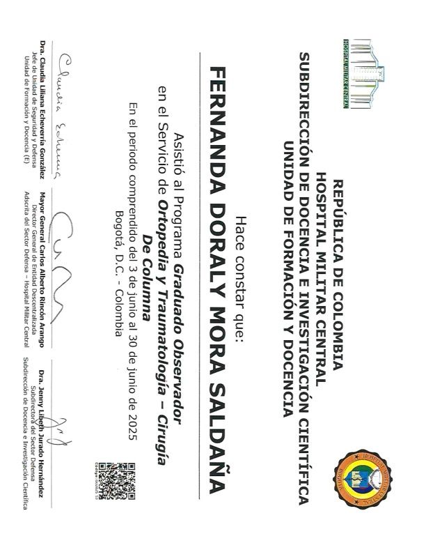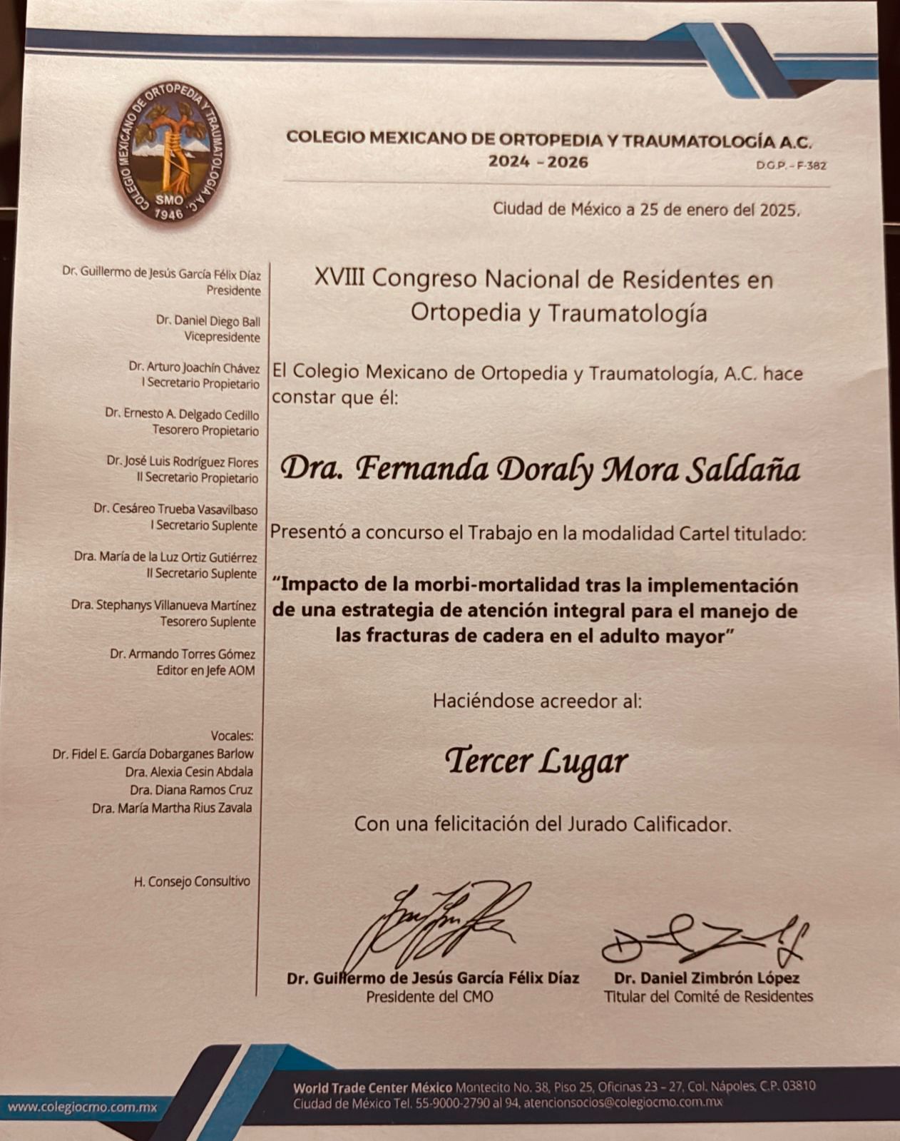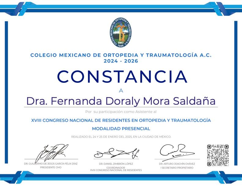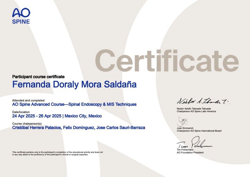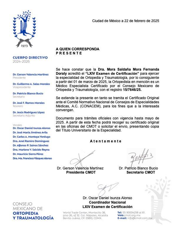 Soy la Dra. Fernanda Mora, especialista en Traumatología y Ortopedia con subespecialidad en Cirugía de Columna, formada en el Hospital de Traumatología y Ortopedia de Lomas Verdes (UNAM).