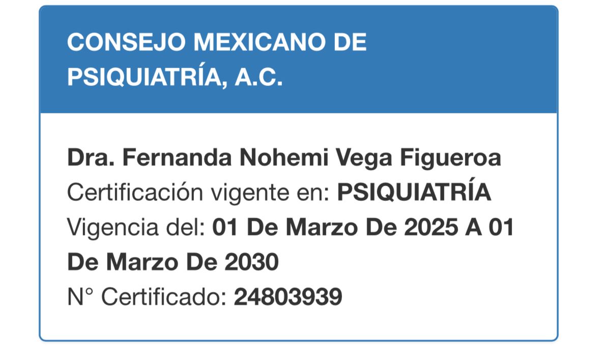 Soy medica cirujana y partera avalada por la UNAM, psiquiatra egresada de la Universidad de Monterrey (UDEM) y certificada por el Consejo Mexicano de Psiquiatría.