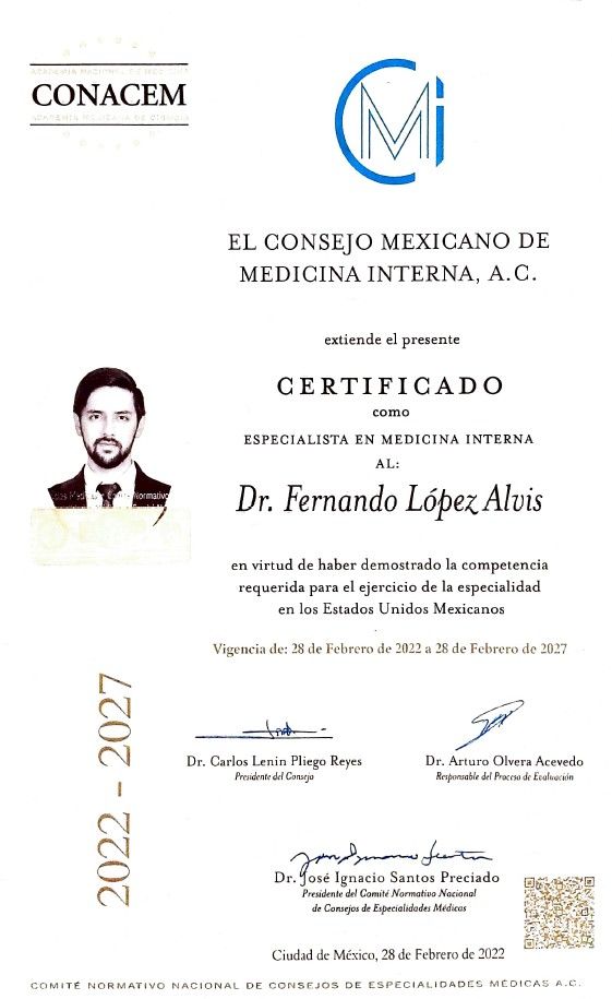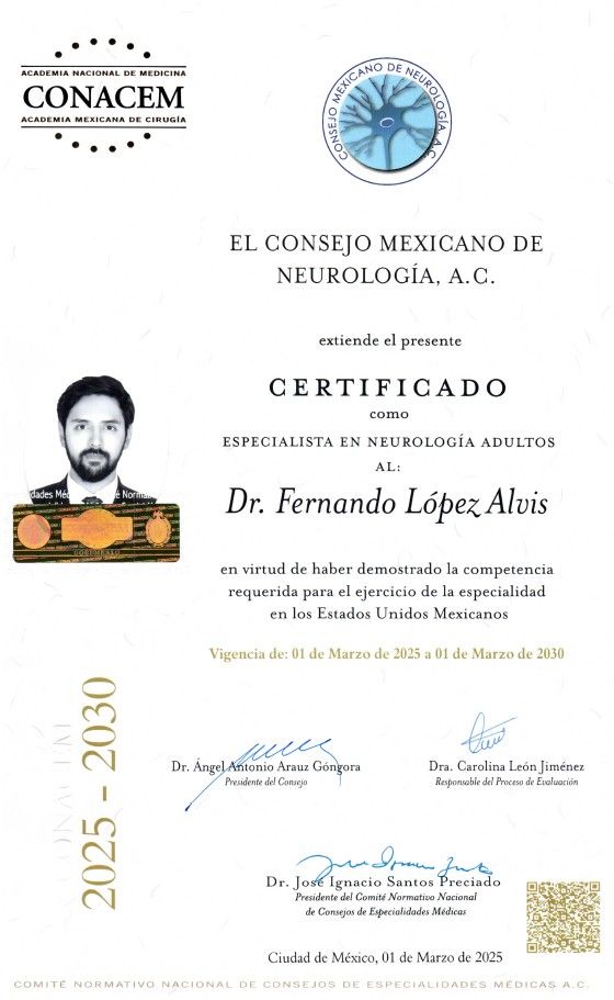 Cuenta con certificaciones vigentes por parte del Consejo Mexicano de Medicina Interna y el Consejo Mexicano de Neurología.