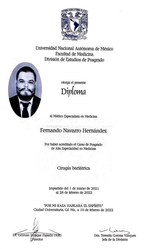 Soy un médico entregado y profesional, cirujano cuidadoso, capaz y actualizado, entrenado en el arte de la cirugía bariátrica, metabólica y laparoscopía avanzada, así como cirugía gastrointestinal y general, con una formación académica de más de 11 años de estudios en los mejores centros del país para brindar un trato individualizado y adecuado al paciente con un enfoque humano de calidez, calidad, integridad y comunicación efectiva.