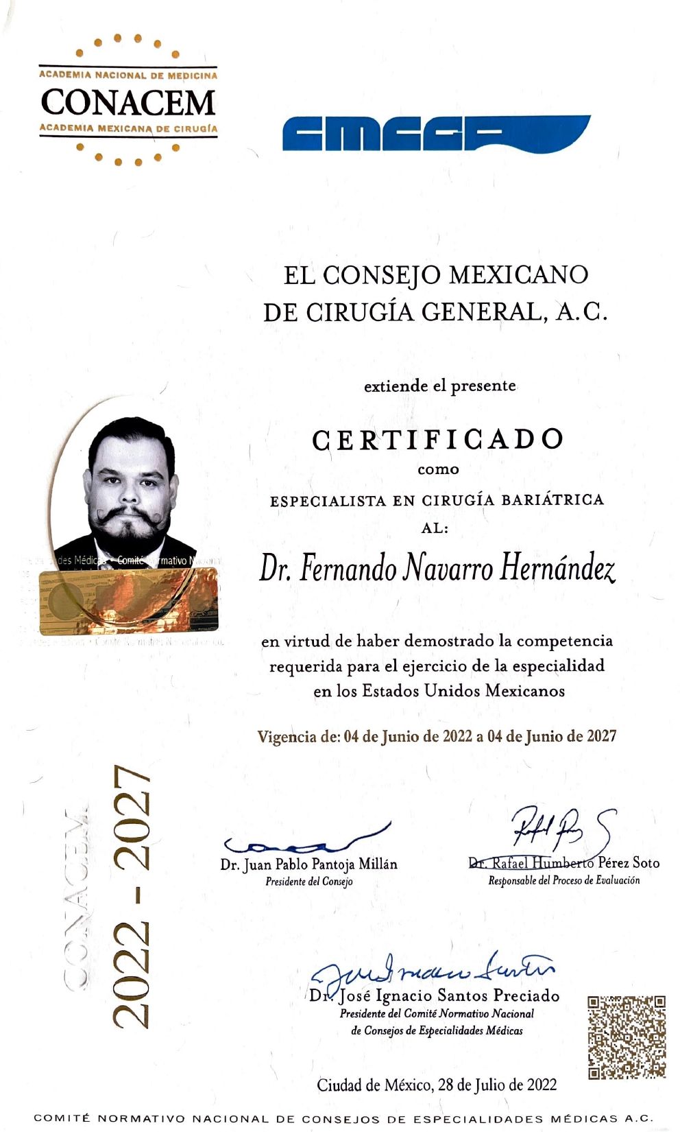 Soy un médico entregado y profesional, cirujano cuidadoso, capaz y actualizado, entrenado en el arte de la cirugía bariátrica, metabólica y laparoscopía avanzada, así como cirugía gastrointestinal y general, con una formación académica de más de 11 años de estudios en los mejores centros del país para brindar un trato individualizado y adecuado al paciente con un enfoque humano de calidez, calidad, integridad y comunicación efectiva.