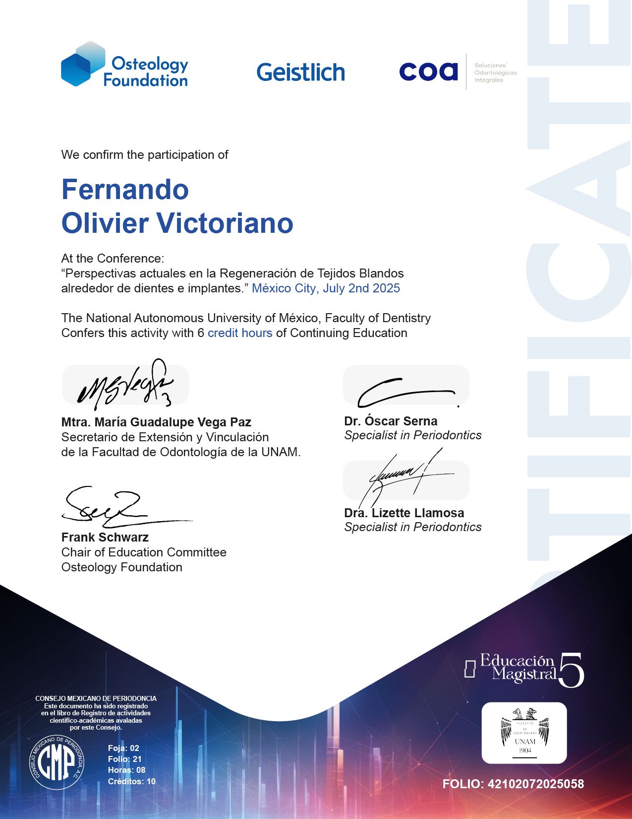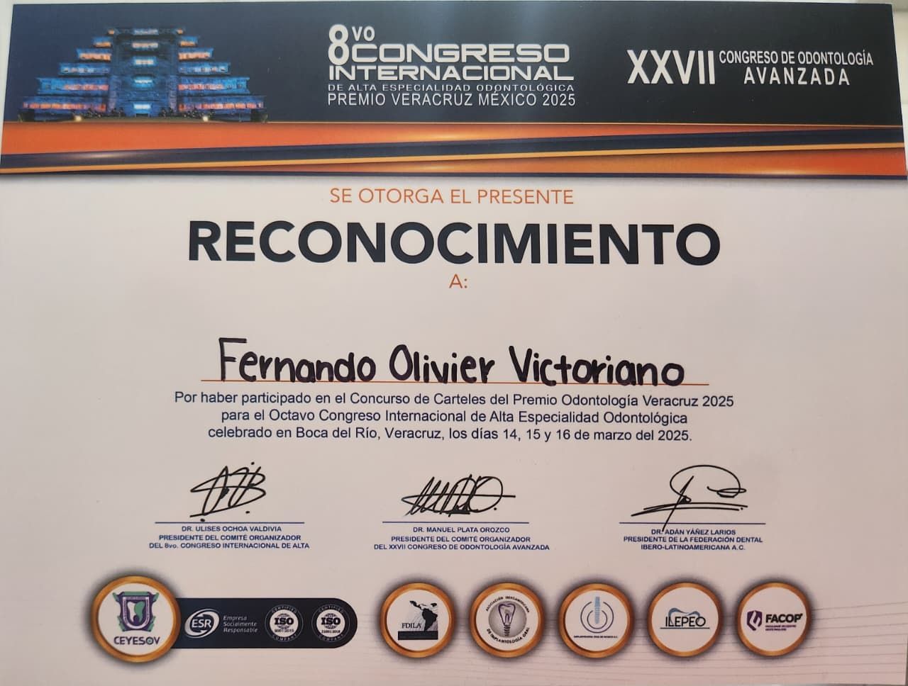 Soy Cirujano Dentista egresado de la universidad Centro de Especialidades y Estudios Superiores Odontológicos de Veracruz(CEYESOV), donde ahí mismo estoy finalizando mi especialidad en Cirujano Bucal. A lo largo del tiempo me he venido actualizando en el campo general de la odontología, con un pequeño enfoque más en el área de cirugía como estudios tomográficos come beam, técnicas anestésicas, autotrasplante dental, procedimientos regenerativos bucales, manejo quirúrgico protésico, abordaje quirúrgico de sonrisa gingival, acondicionamiento de tejidos blandos periodontales, patologías maxilares, injertos dentales, cirugías de terceros molares con diferentes tipos de angulaciones y retenciones.