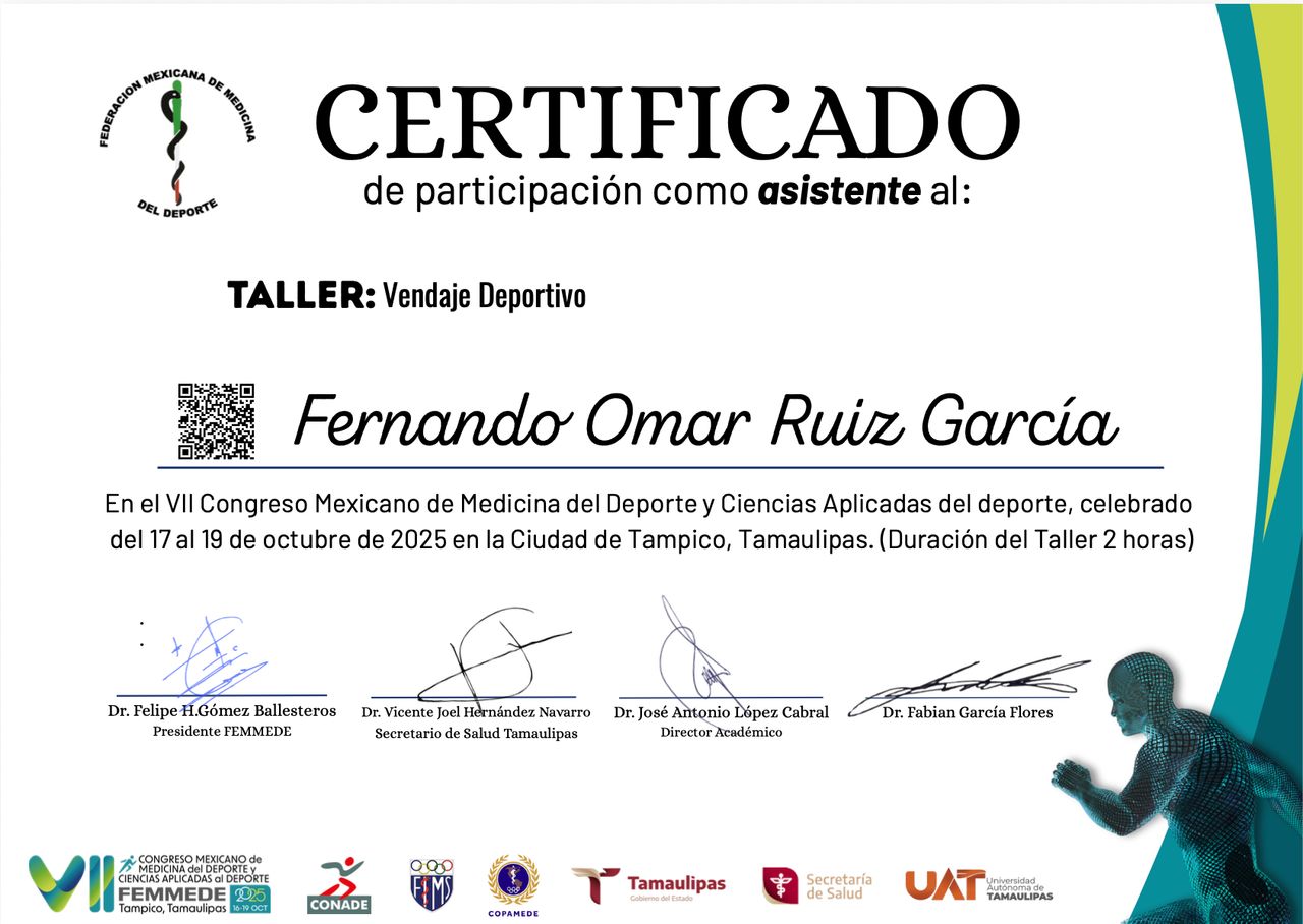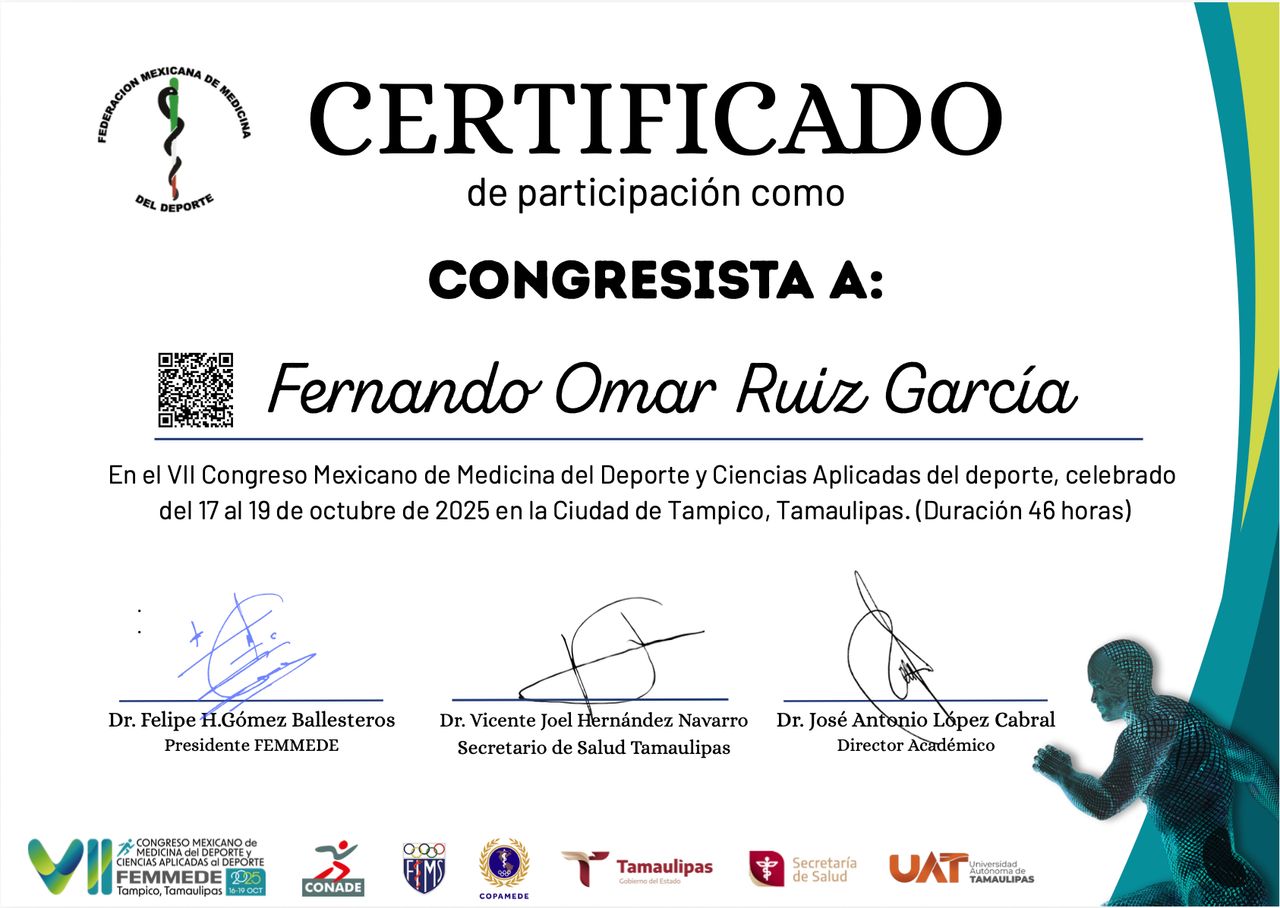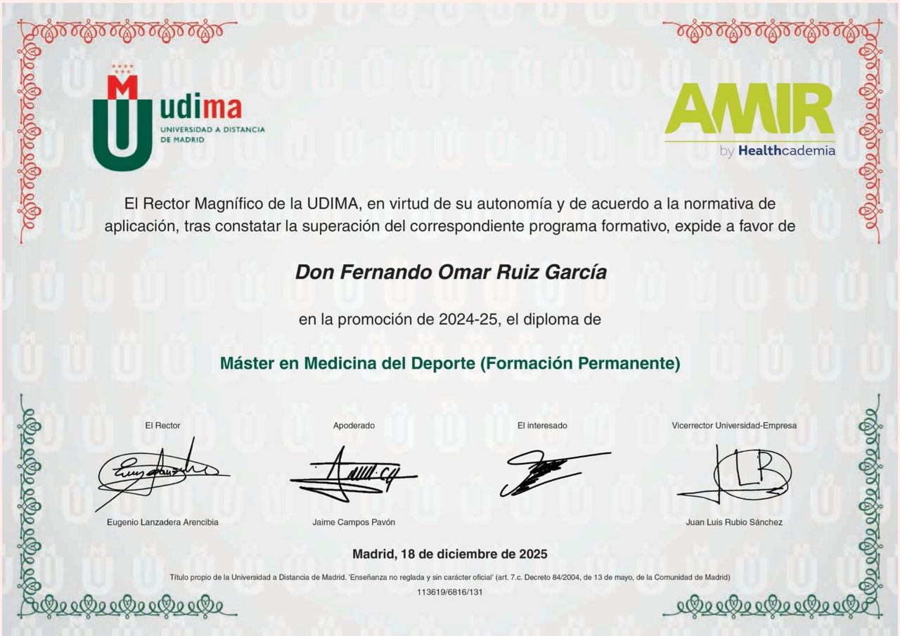 Soy el Dr. Fernando Omar Ruiz García, médico cirujano egresado de la Universidad Justo Sierra, con Máster en Medicina del Deporte por la Universidad a Distancia de Madrid (UDIMA) y Diplomado en Cuidados Paliativos por la Universidad Anáhuac.