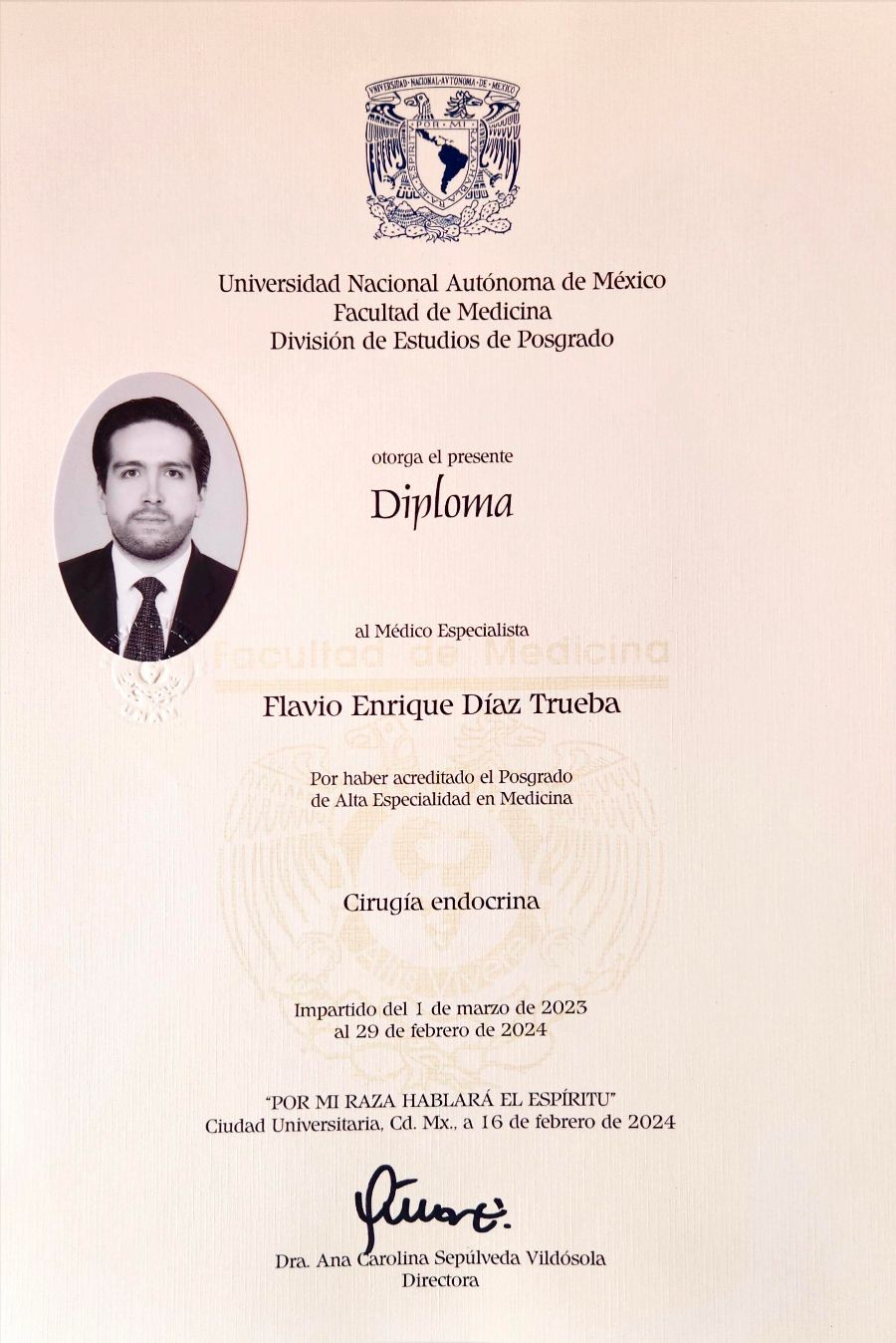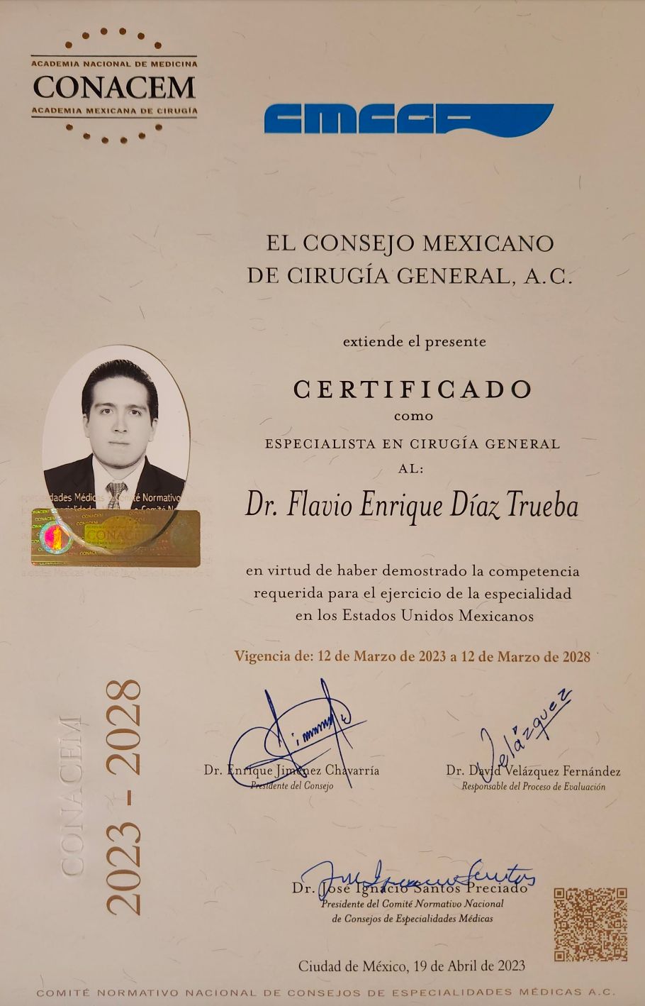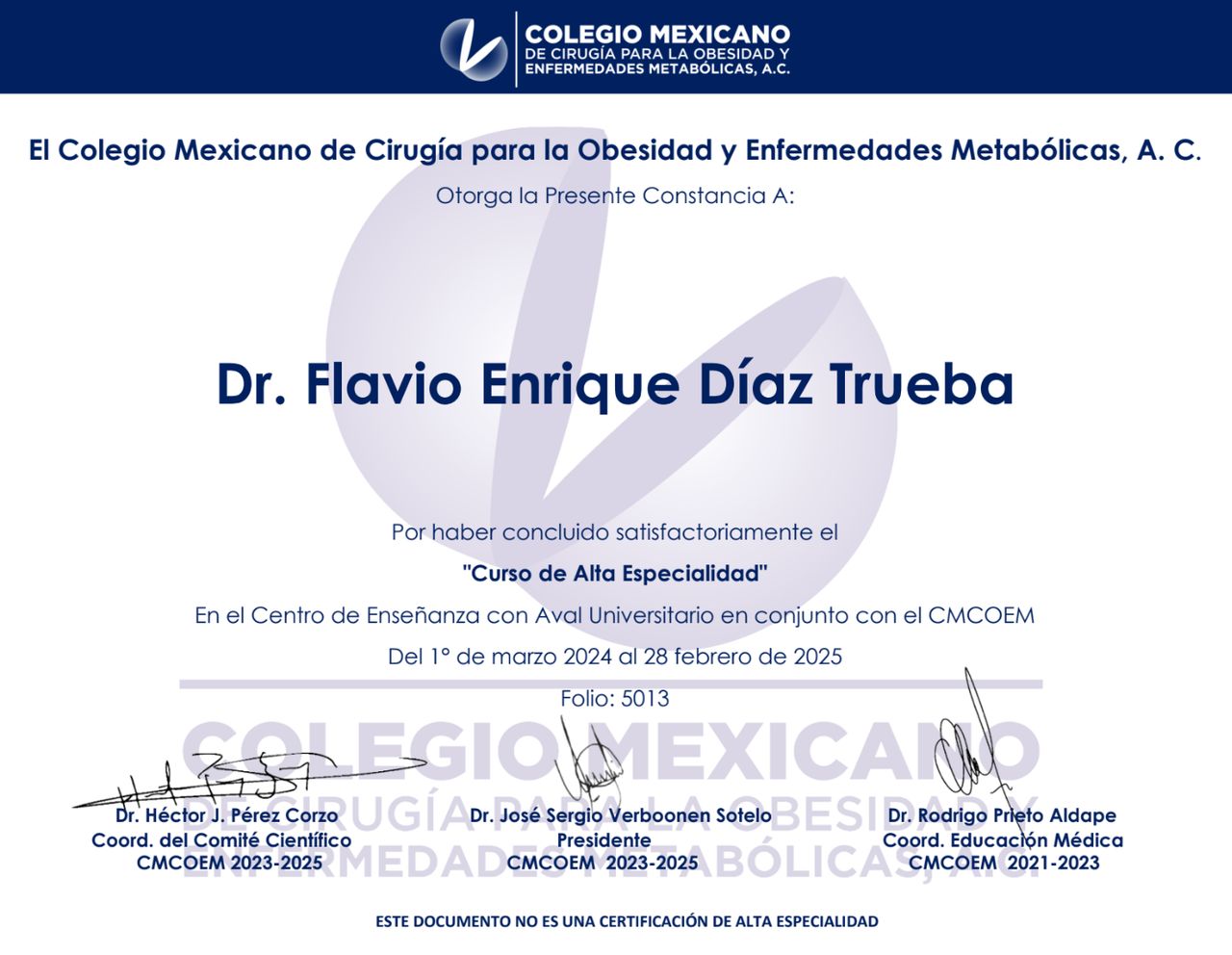 Soy el Dr. Flavio Enrique Díaz Trueba, realicé mis estudios de pregrado en la Universidad Veracruzana con posterior formación como especialista en Cirugía General en el Instituto Nacional de Ciencias Médicas y Nutrición "Salvador Zubirán" cursando dentro del mismo 2 altas especialidades, tanto en Cirugía Bariátrica como en Cirugía Endocrina.