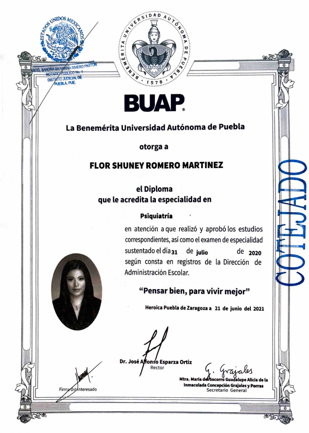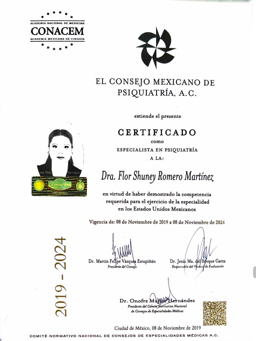 Soy médico psiquiatra egresada de la BUAP y del Hospital Psiquiátrico “Dr. Rafael Serrano”, con certificación vigente por el Consejo Mexicano de Psiquiatría. Cuento con formación avanzada en psicoterapia individual, de pareja y familia, así como especialización en trastornos de la conducta alimentaria, adicciones y salud emocional.