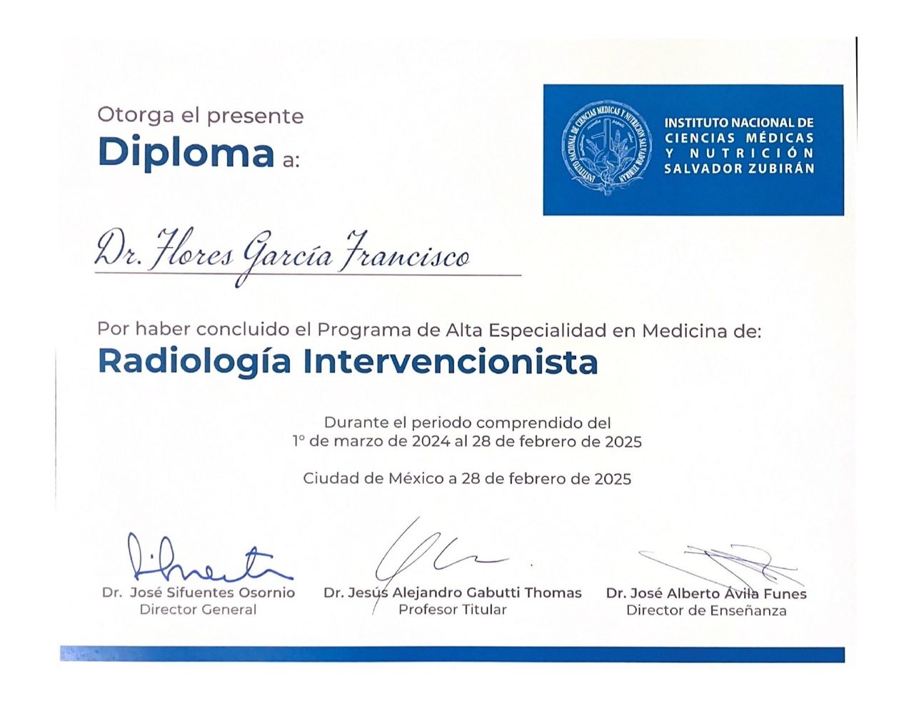- Alta especialidad en Radiología Intervencionista en el INCMNSZ, avalado por la UNAM y con Diploma por parte del CMRI