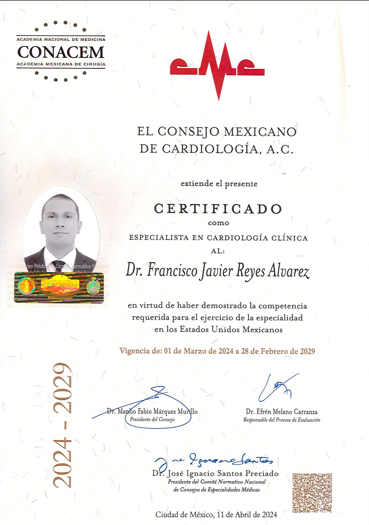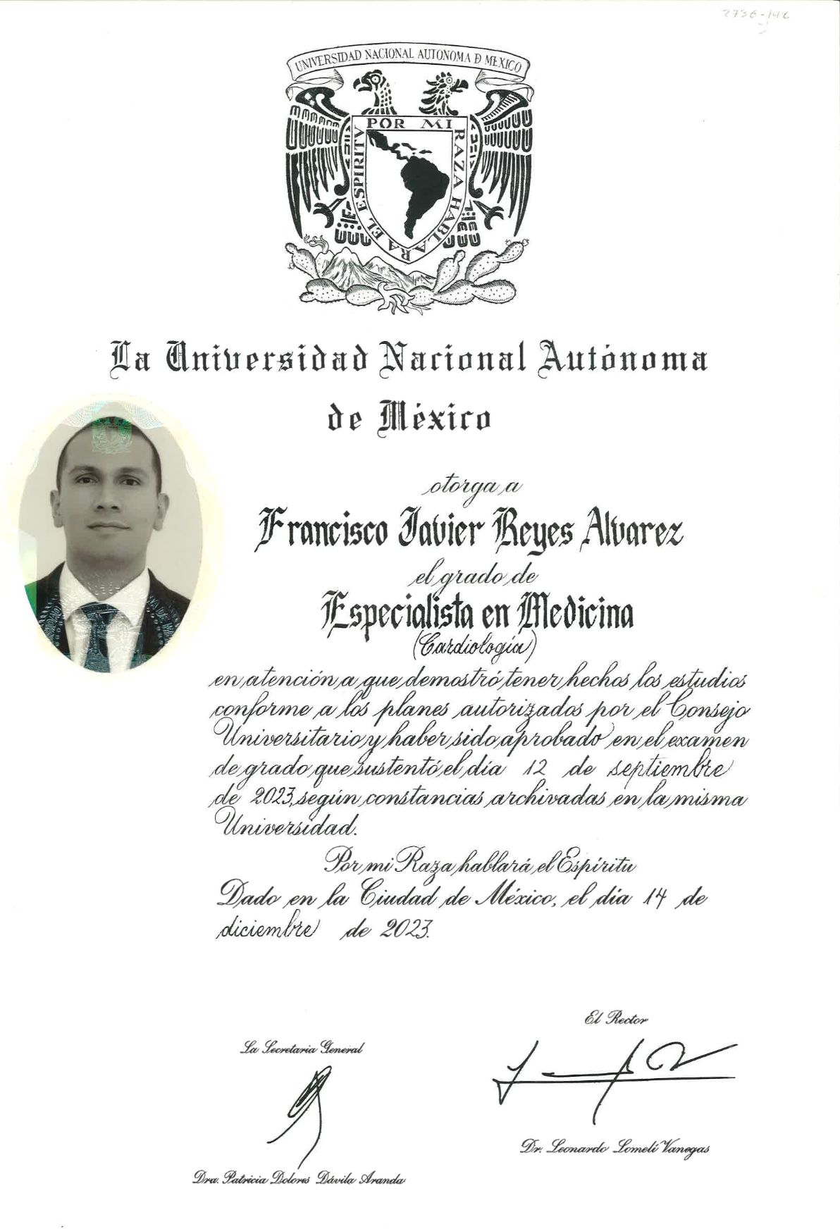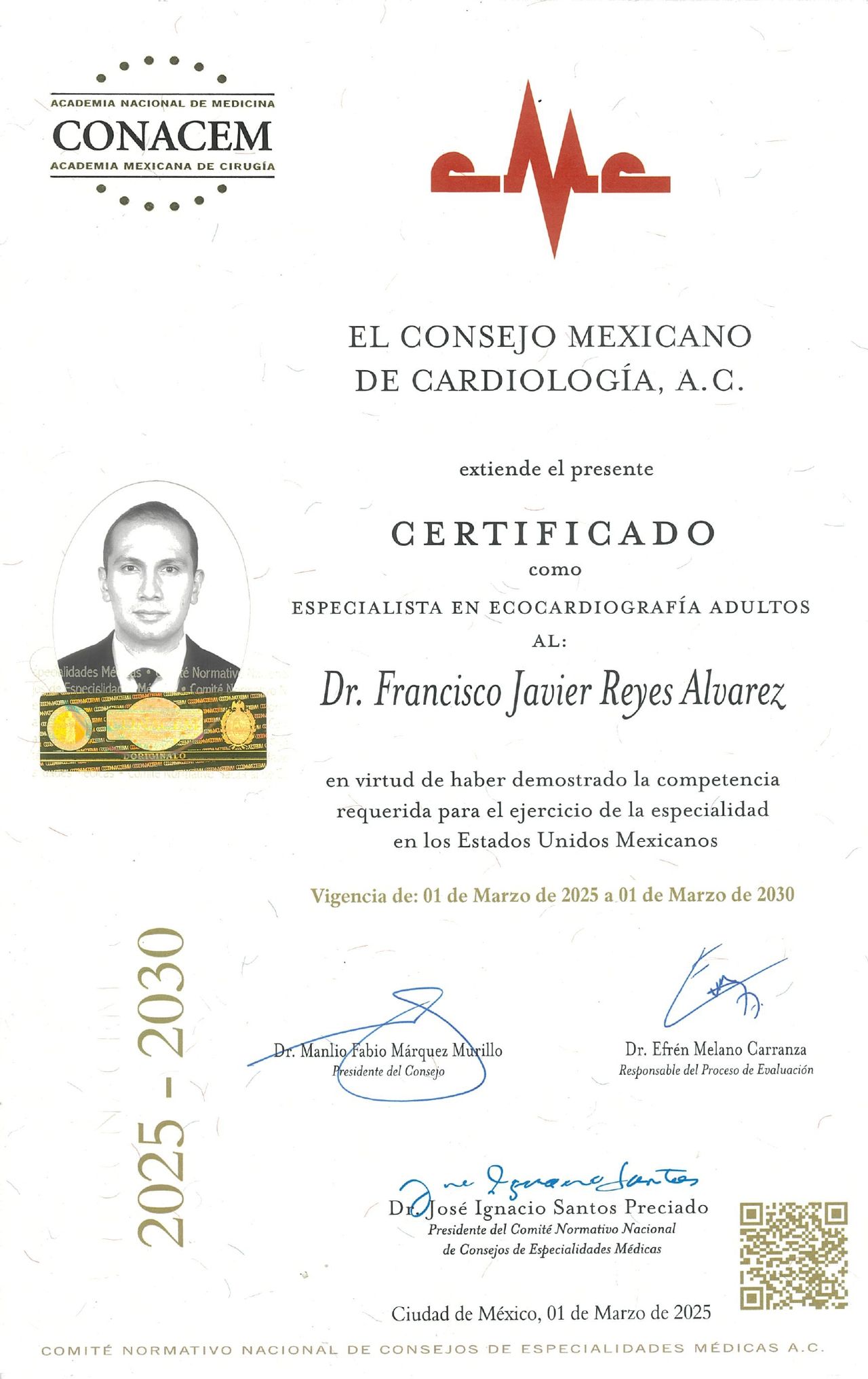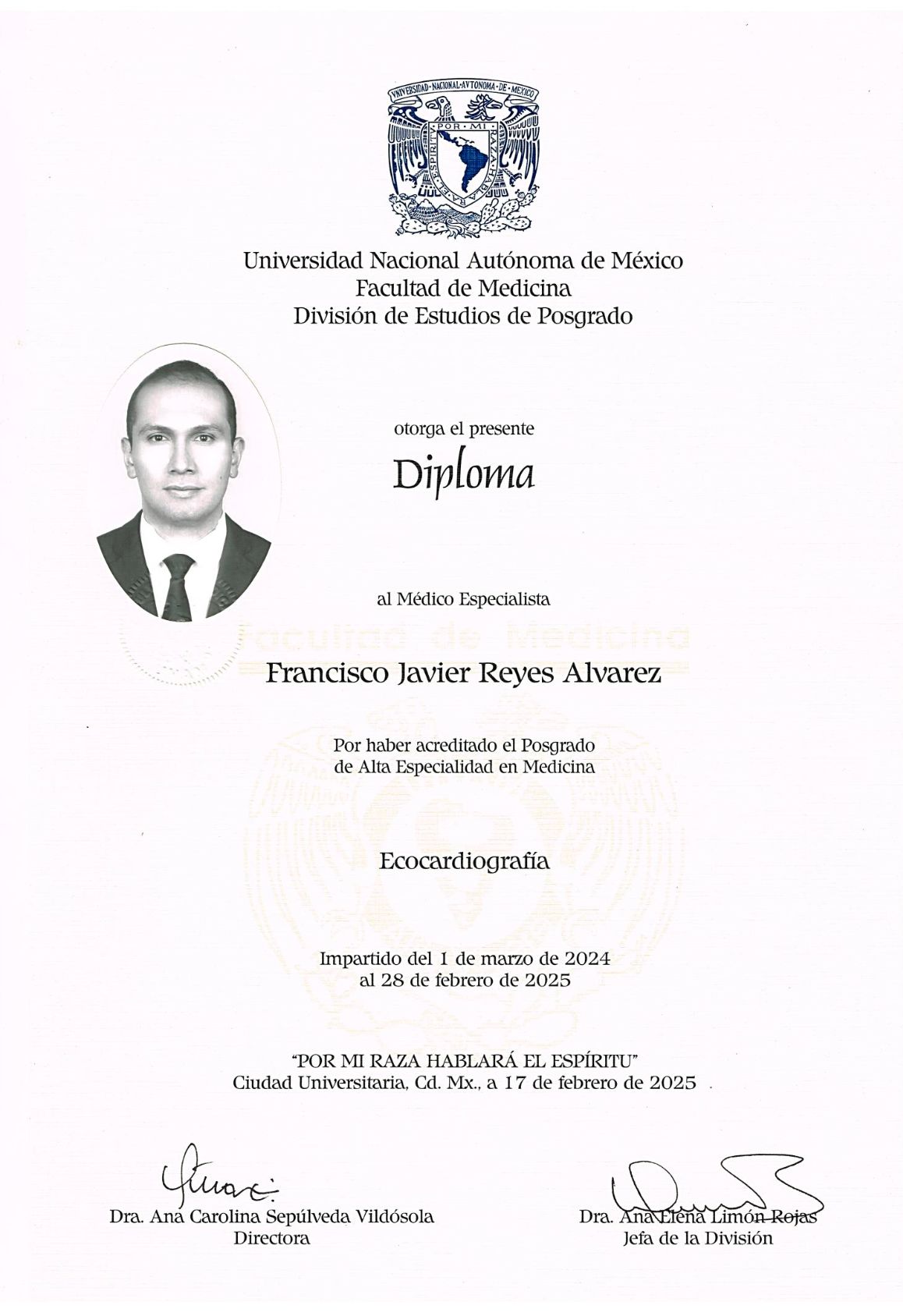 Soy el Dr. Francisco Javier Reyes Alvarez dentro de mi trayectoria académica, realicé 2 años de Medicina Interna en HGZ 33 IMSS en la ciudad de Monterrey NL, posteriormente realicé la especialidad de Cardiología Clínica en el Hospital de Especialidades Centro Médico Nacional La Raza y la alta especialidad en Ecocardiografia Adultos en el Instituto Nacional de Cardiologia Ignacio Chávez. Ambas formaciones están avaladas por la Universidad Nacional Autónoma de México, actualmente soy miembro titular de la Sociedad Mexicana de Ecocardiografia e Imagen Cardiovascular (SOMEIC).
