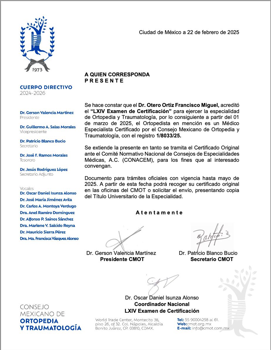 ¡Hola! Soy el Dr. Francisco Miguel Otero Ortiz, Cirujano Ortopedista egresado del Instituto Nacional de Rehabilitación (INR). Tengo amplia experiencia en fracturas, lesiones articulares y enfermedades musculoesqueléticas crónicas. Mi compromiso es brindar atención médica personalizada, ética y de alta calidad, siempre poniendo al paciente en el centro de cada decisión.