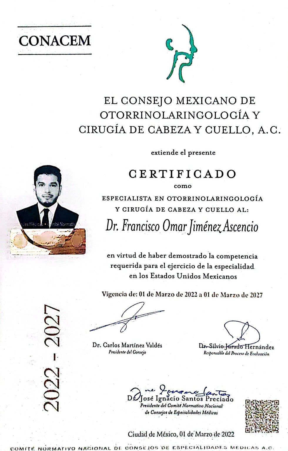 Hola, soy el Dr. Francisco Omar Jiménez Ascencio especialista en Otorrinolaringología y Cirugía de Cabeza y Cuello con Alta Especialidad en Rinología y Cirugía Plástica Facial.