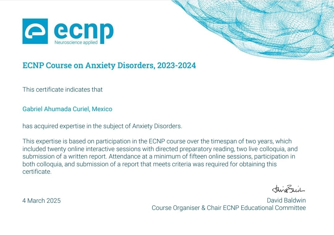 Médico psiquiatra y neuropsiquiatra egresado de una de las instituciones más importantes en la atención de salud mental en México y único psiquiatra mexicano y residente de América Latina con certificación en manejo de Trastornos de ansiedad por el Colegio Europeo de Neuropsicofarmacología (ECNP), colegio reconocido a nivel internacional y de suma relevancia en el área de neurociencias.