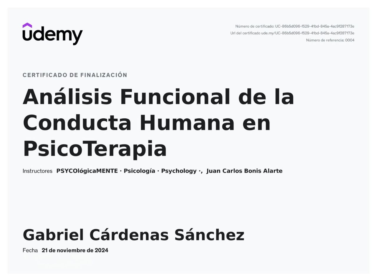 Mi formación en análisis funcional de la conducta me permite comprender tu problemática y la manera en que se mantiene en tu vida diaria. A partir de ello, trabajaremos juntos para delimitar objetivos claros, realistas y alcanzables para ti.