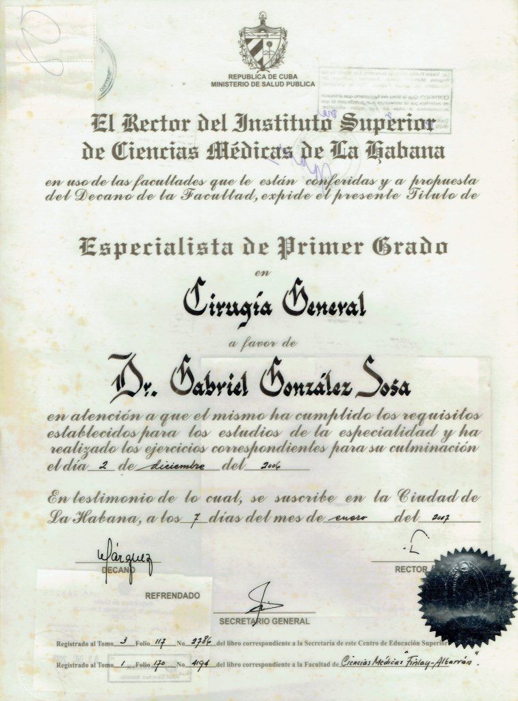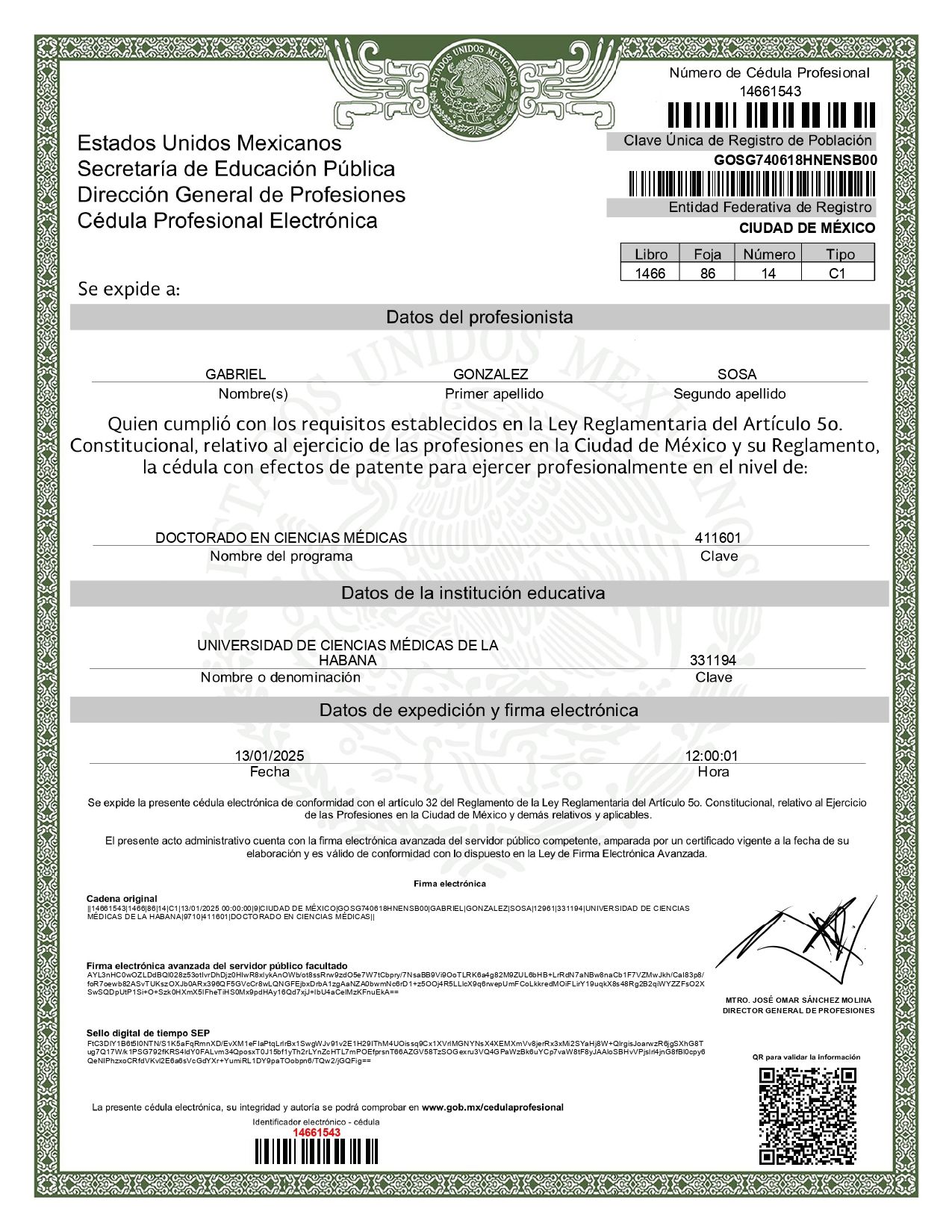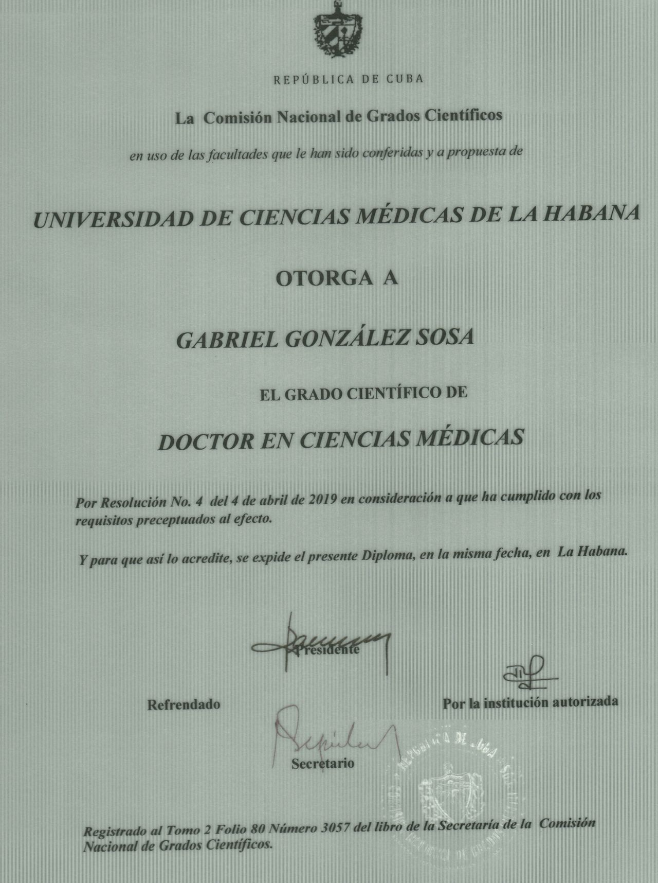 Graduado de Licenciatura en Medicina (1999), Especialista en Medicina General Integral (2001), Especialista en Cirugía General y Laparoscópica (2006) y Doctorado en Ciencias Médicas (2018). Todos mis estudios de pregrado y postgrado realizados en la Universidad de Ciencias Médicas de la Habana, Cuba. Experiencia como Licenciado en Medicina (26 años) y como Especialista en Cirugía General y Laparoscópica (19 años). Profesor Titular de Cirugía General del Departamento de Cirugía General de la Universidad de Ciencias Médicas de La Habana, Cuba e Investigador Titular de la Academia de Ciencias de Cuba. En mi aval como médico especialista cuento con 91 cursos de postgrado impartidos y/o recibidos (69 nacionales y 22 internacionales), participación en 105 eventos de carácter científico (74 nacionales y 31 internacionales) con 70 trabajos presentados en los mismos y un total de 19 publicaciones científicas en revista de alto impacto. Tutor de formación de varios médicos residentes de Cirugía General de distintas nacionalidades y de sus tesis de terminación de la especialidad, así como he sido tutor y oponente de tesis de Maestría y Doctorado. Miembro de la Sección de Cirugía Torácica de la Sociedad Cubana de Cirugía (2003), de la Sociedad Cubana de Cirugía General (2007) y de la Sociedad Ibero-Latinoamericana de Cirugía General (2012).