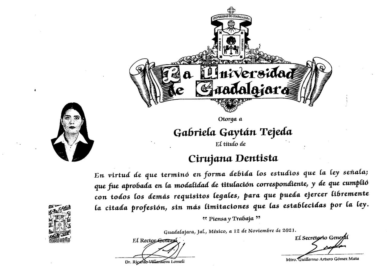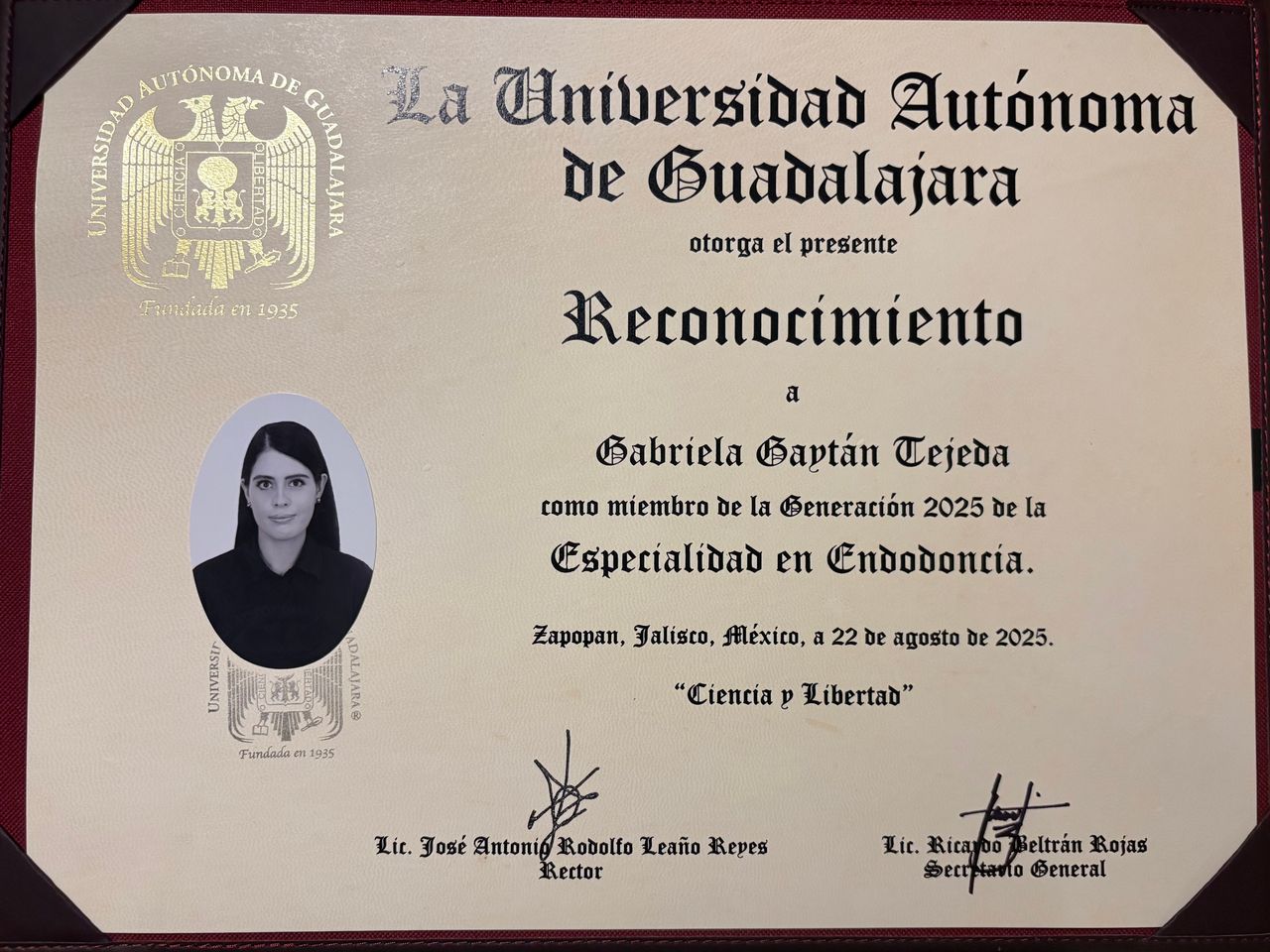 Hola, soy Gabriela Gaytán, Licenciada Cirujana Dentista por la Universidad de Guadalajara y Especialista en Endodoncia por la Universidad Autónoma de Guadalajara.