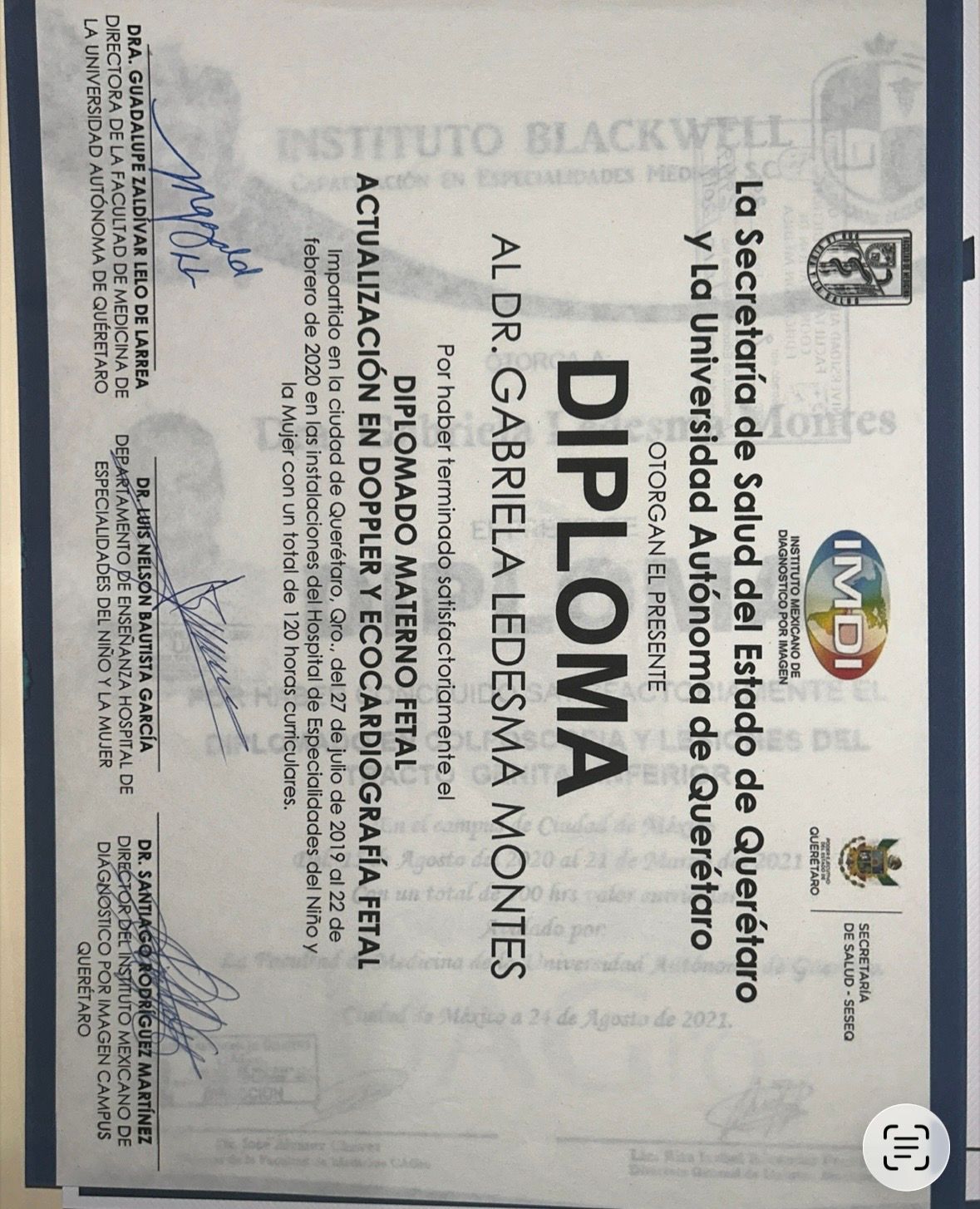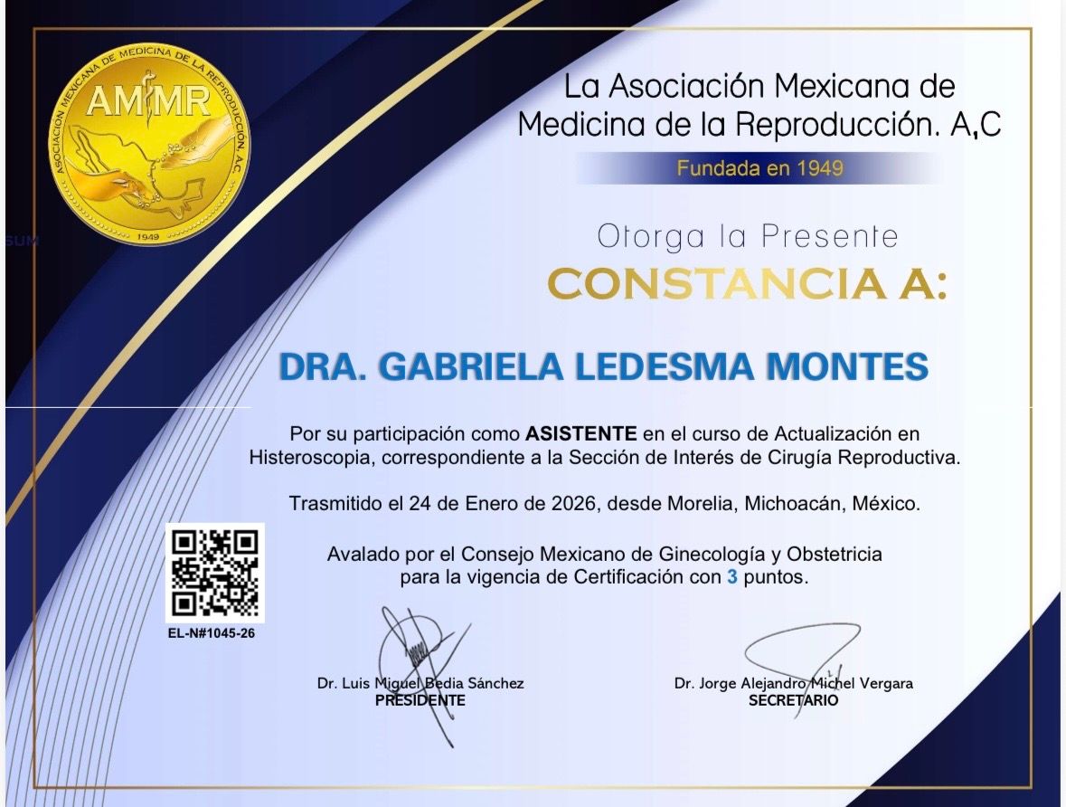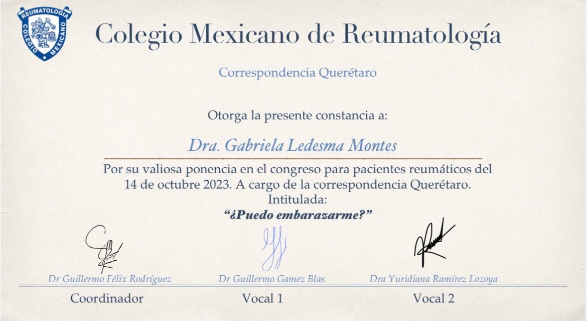 Dra Gabriela Ledesma Montes Especialista en Ginecología y Obstetricia Egresada de UNAM, UMAE 4 IMSS Luis Castelazo Ayala Diplomado Internacional en Menopausia Avalado por COMEGO Diplomado Doppler Fetal Avalado por la UAQ Diplomado en colposcopia Diplomado ¨Uso del Laser en el tracto genital Inferior y Ginecología regenerativa¨, avalado por el Colegio Mexicano de Ginecólogos dedicados a la Colposcopía, A. C. Master en Manejo Integral de la Menopausia por INPER ( Instituto Nacional de Perinatología), Diplomado en Menopausia por la Universidad de Sinaloa.