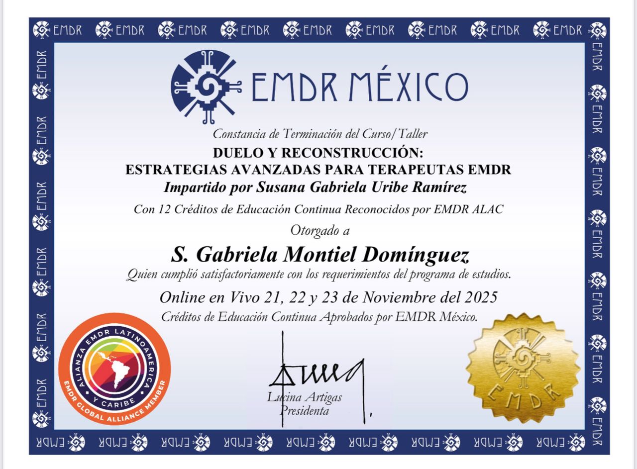 soy Terapeuta EMDR, trt. Terapia de Reprocesamiento del Trauma; Especialista en Sexualidad humana, con un enfoque Cognitivo Conductual, trabajo con la comunidad LGBT+, trabajadores sexuales y público en general, con Maestría Internacional en Terapia de Pareja por la universidad Española Esneca Business School de Lleida España. Diplomada en Psicoterapia Integral Avanzada, Diplomada en Depresión y Diplomada en estrés y Ansiedad por el Instituto Nacional de Neurociencias, Neuropsicología y Neurorehabilitación IN4 en España.