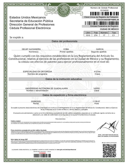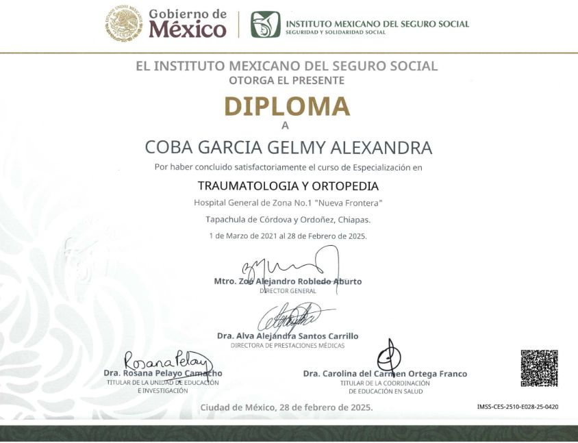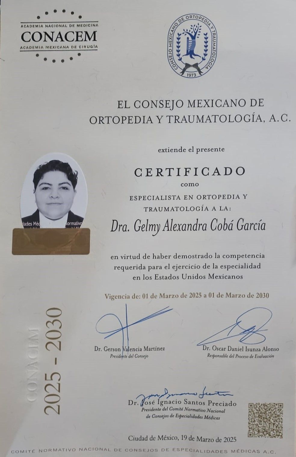 Certificada por el Consejo Mexicano de Ortopedia y Traumatología, A. C. No. Certificado: 31/8393/25