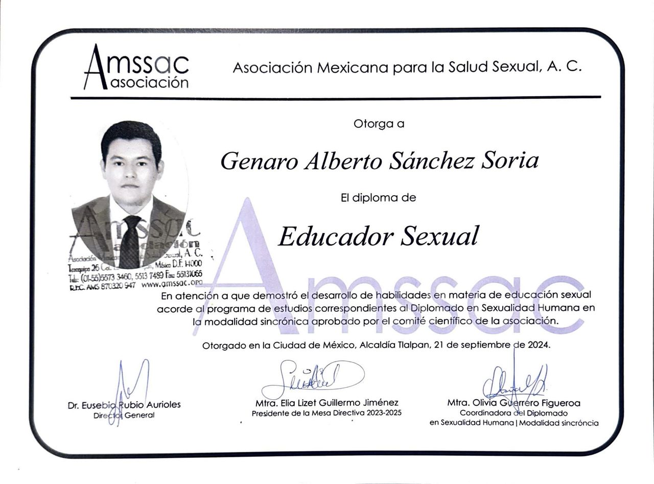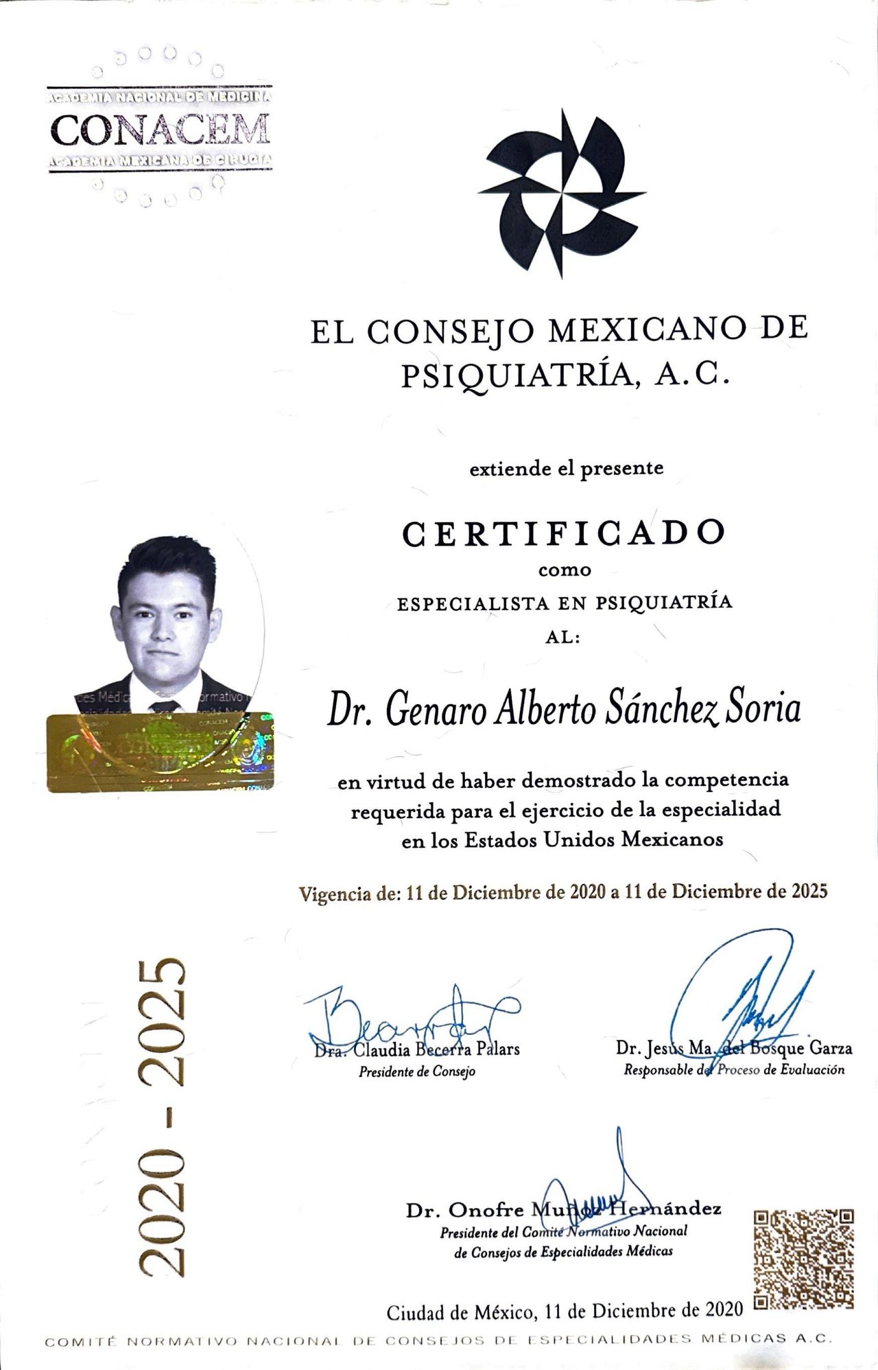 Me encuentro certificado por el Consejo Mexicano de Psiquiatría y dentro de mi formación profesional cuento con un diplomado en Sexualidad Humana y Educación Sexual por la Asociación Mexicana para la Salud Sexual y Sexología.