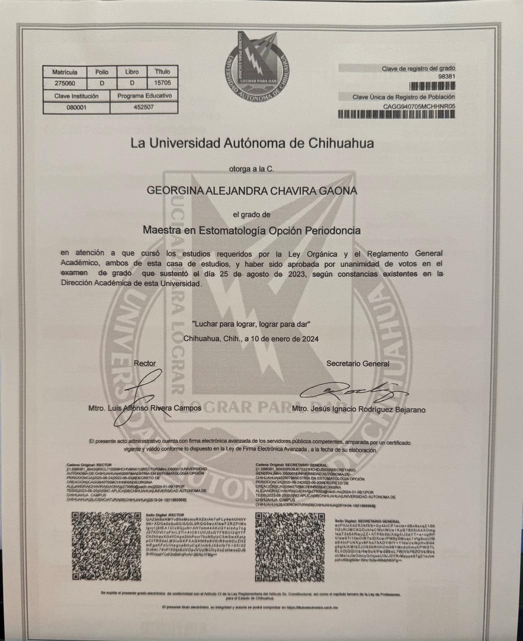 Soy egresada de la Universidad Autónoma de Chihuahua (UACH) en el año 2019, posteriormente me recibí como Maestra en Estomatología Opción Periodoncia de la Universidad Autónoma de Chihuahua en el año 2024.