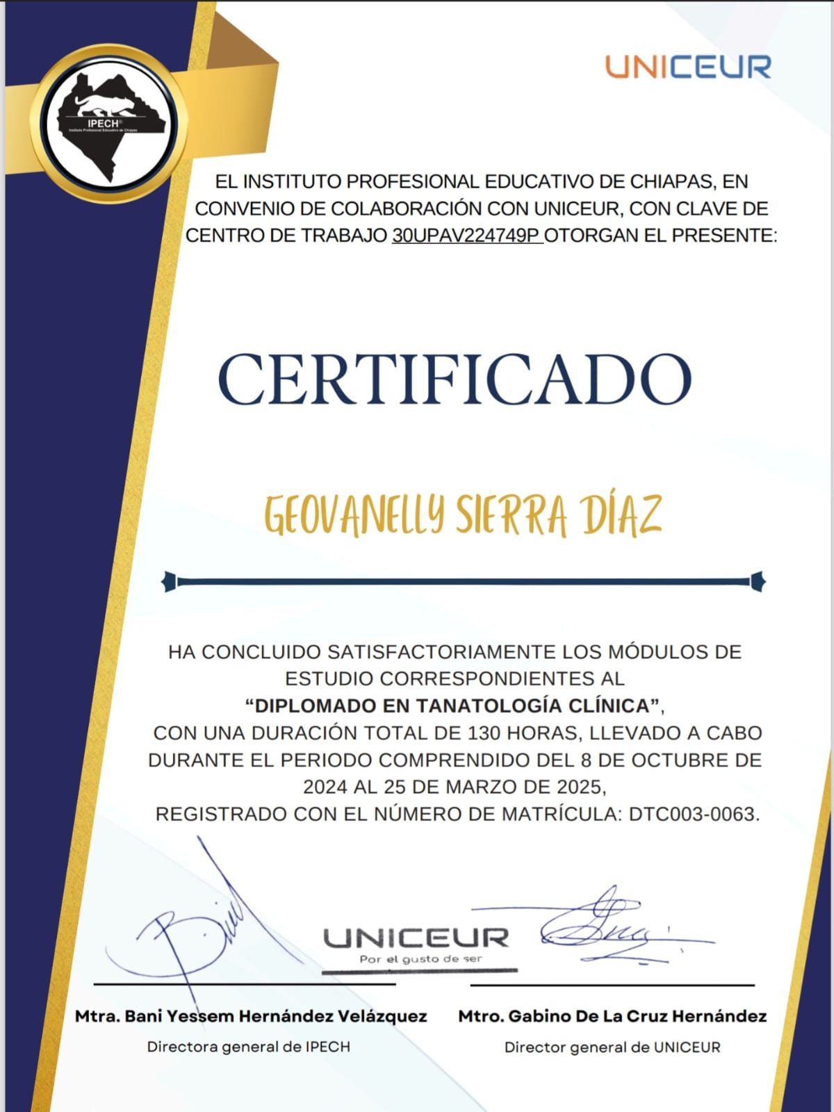 Maestría en Psicoterapia Transpersonal Integrativa. Diplomado en Tanatología Clínica. Diplomado en Psicología del Deporte. Dipomado en Psicología Clínica, Curso en Neurobiología del aprendizaje TEA y TDAH