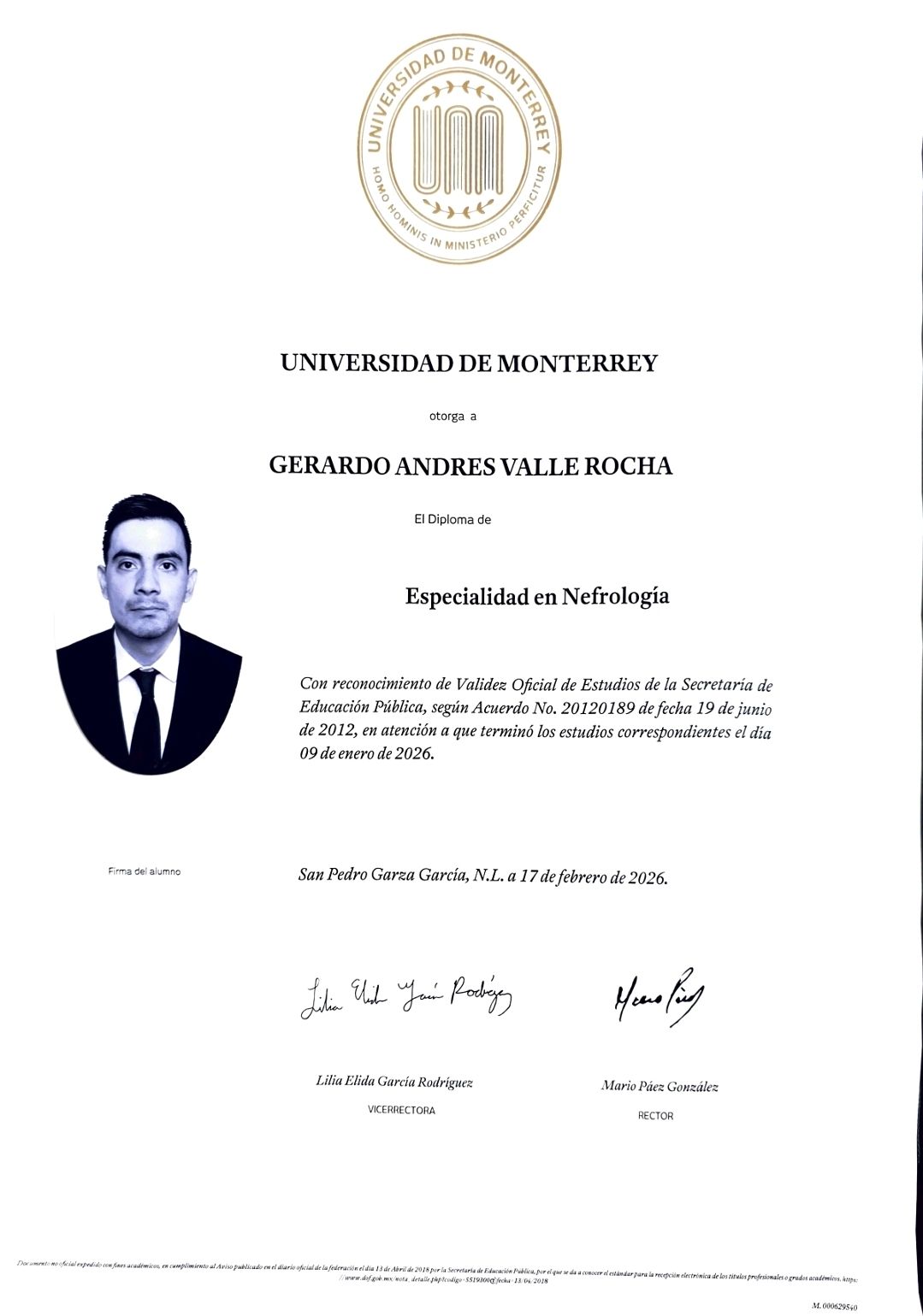 Soy médico especialista en nefrología, egresado de la Universidad Autónoma de Baja California (UABC), campus Mexicali. Cuento con formación en Medicina Interna tras realizar dos años de residencia en Monterrey, y posteriormente cursé tres años de subespecialidad en Nefrología en la Unidad Médica de Alta Especialidad No. 25 del IMSS, Monterrey, Nuevo León.