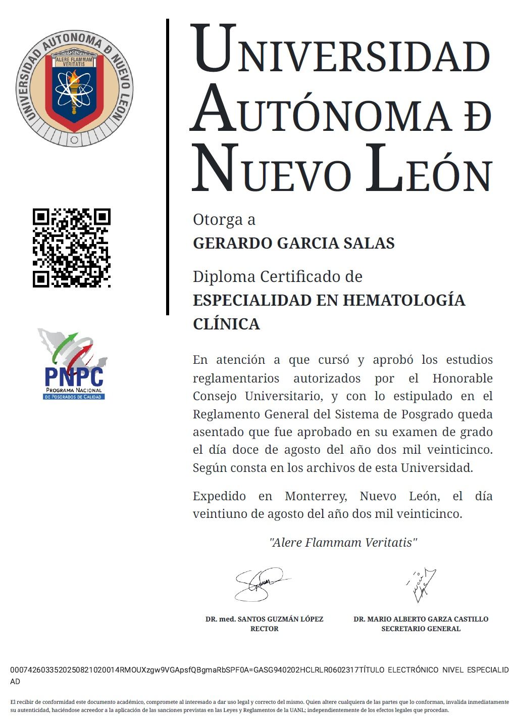 Soy médico hematólogo certificado por el Consejo Mexicano de Hematología (Ced.Prof. 15146198), egresado de la Universidad Autónoma de Nuevo León, en Monterrey, México.