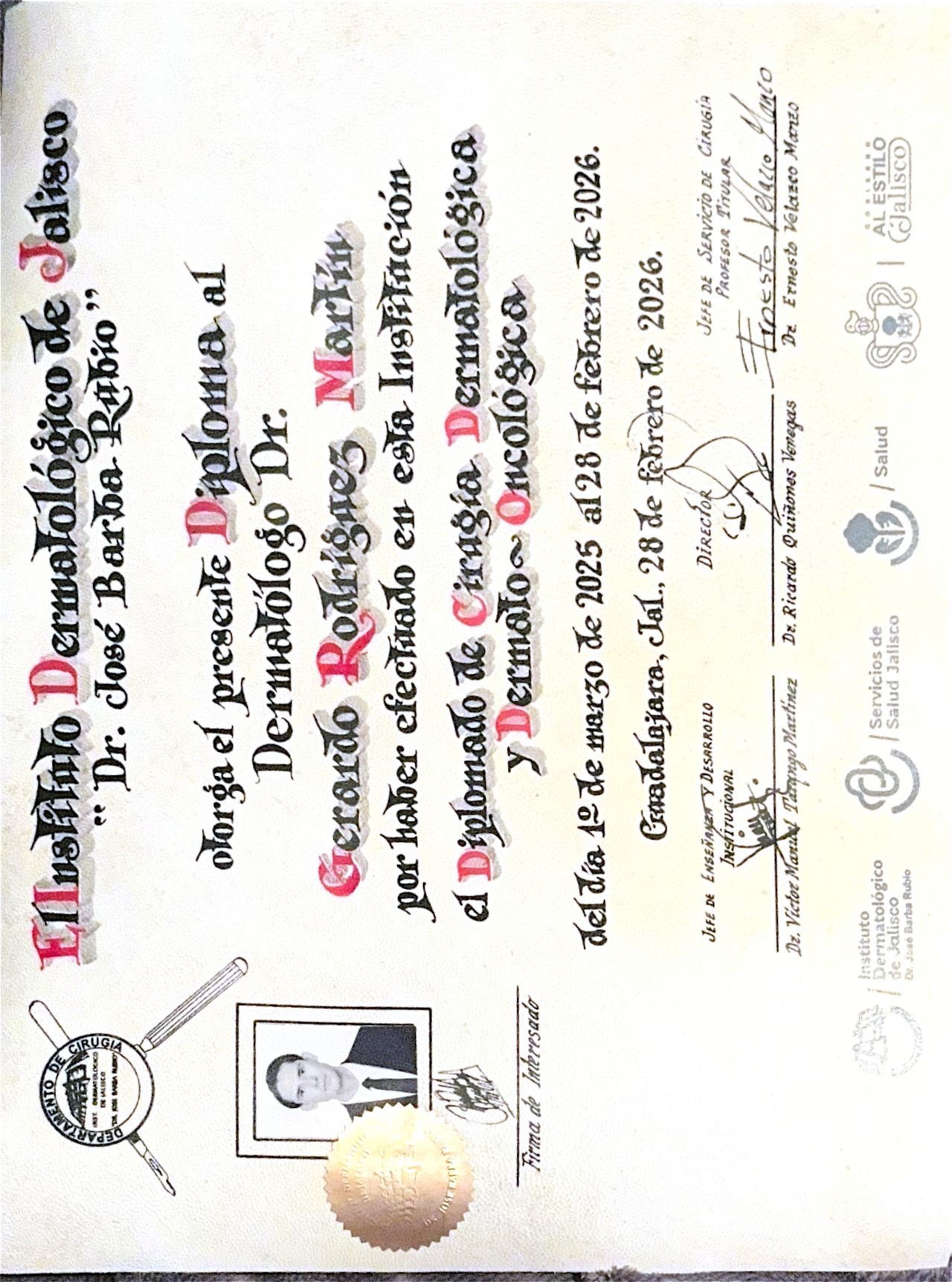 Soy Médico Cirujano y Partero egresado de la Universidad de Guadalajara, con formación en Dermatología y alta especialidad en Cirugía Dermato-Oncológica en el Instituto Dermatológico de Jalisco.