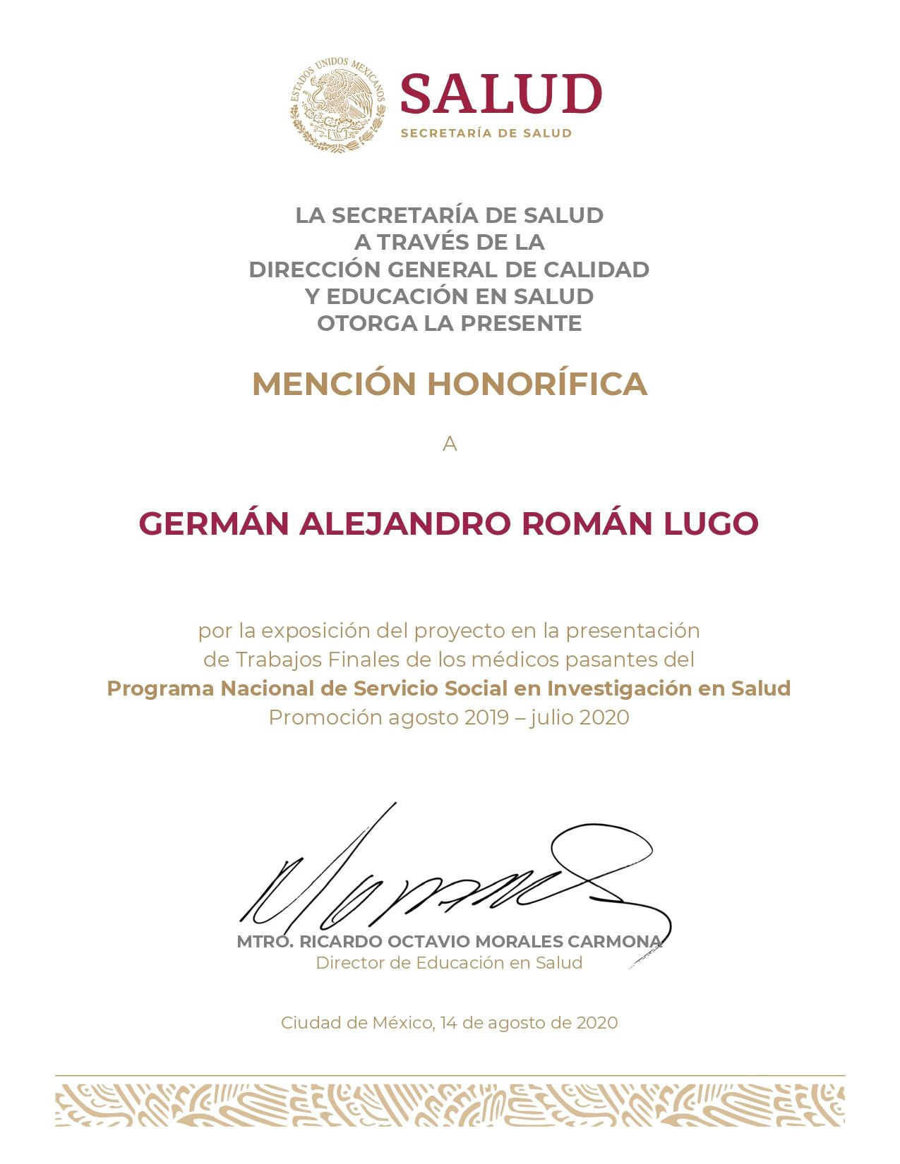 Egresado con Mención Honorífica del Centro Médico Nacional Siglo XXI (UNAM), reconocido como el mejor hospital público del país.