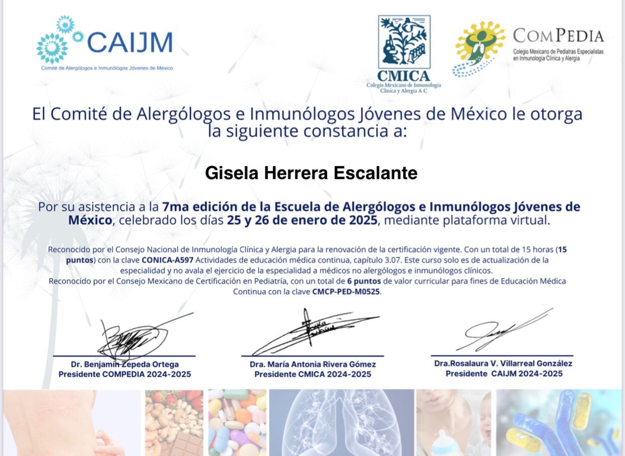 -Certificada por el Consejo Nacional de Inmunología Clínica y Alergia (CONICA)