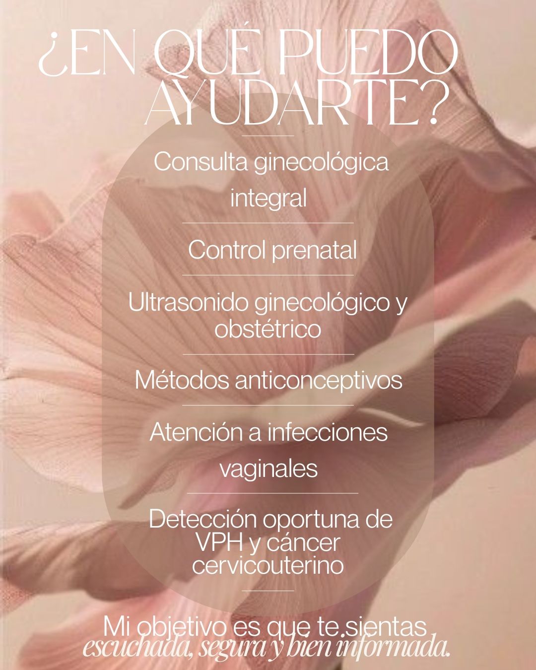 Como ginecóloga y obstetra, mi compromiso es brindarte una atención integral, cercana y basada en evidencia, acompañándote desde la prevención, el cuidado de tu salud íntima, la planificación familiar, hasta el embarazo y el control prenatal.
